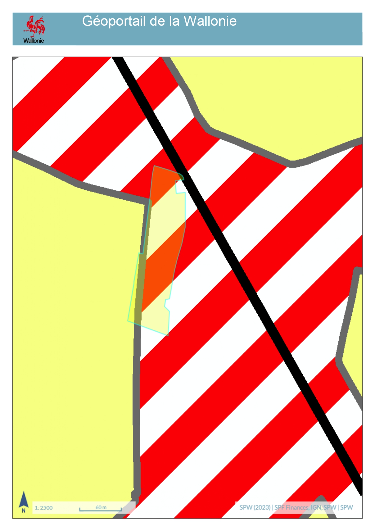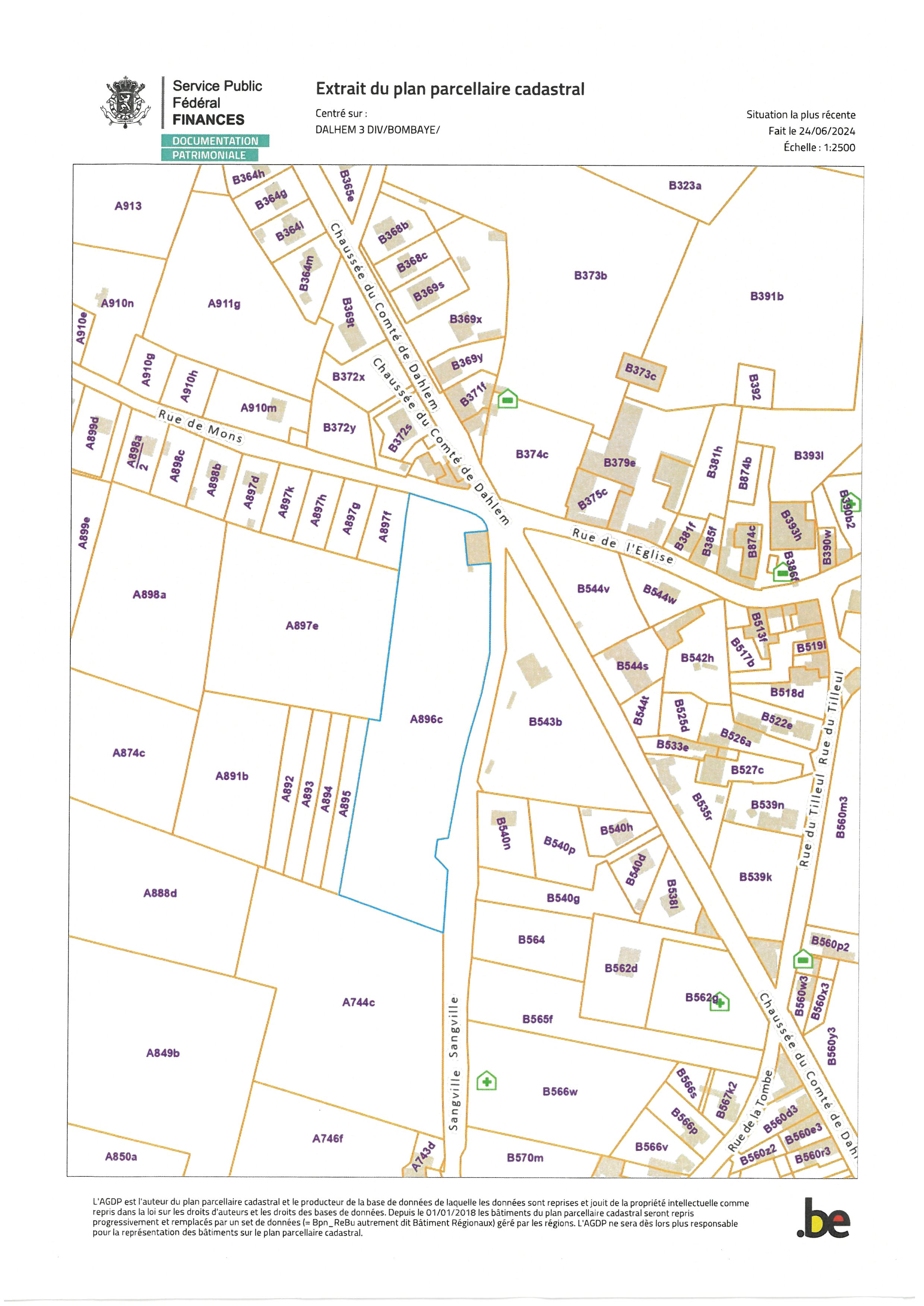 Voorgevel : +/- 210 m op Chemin de Sangville en +/- 45 m op Rue de Mons.