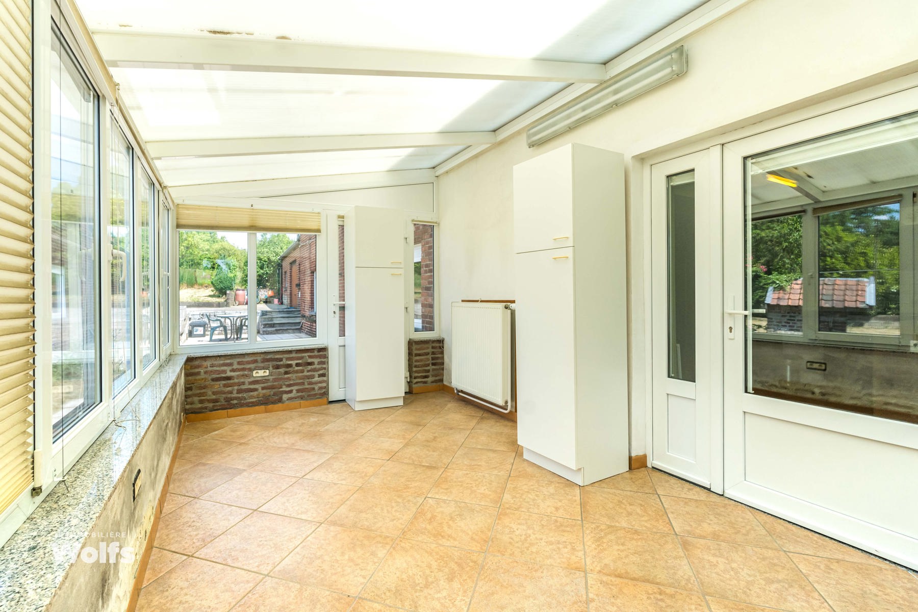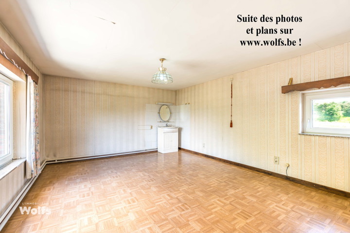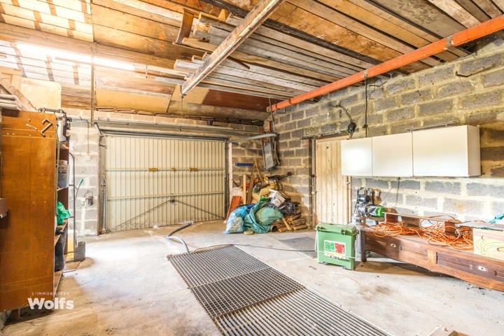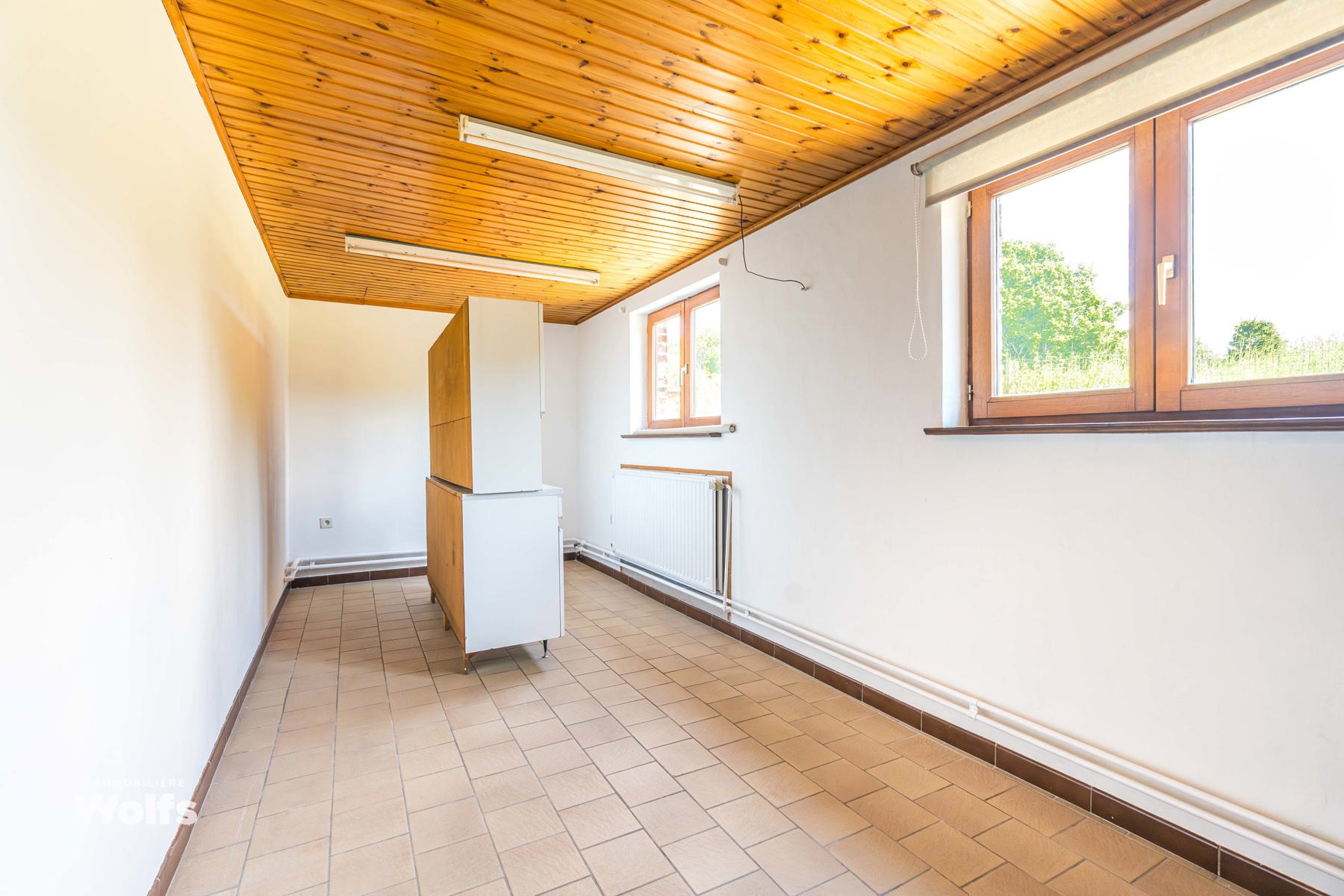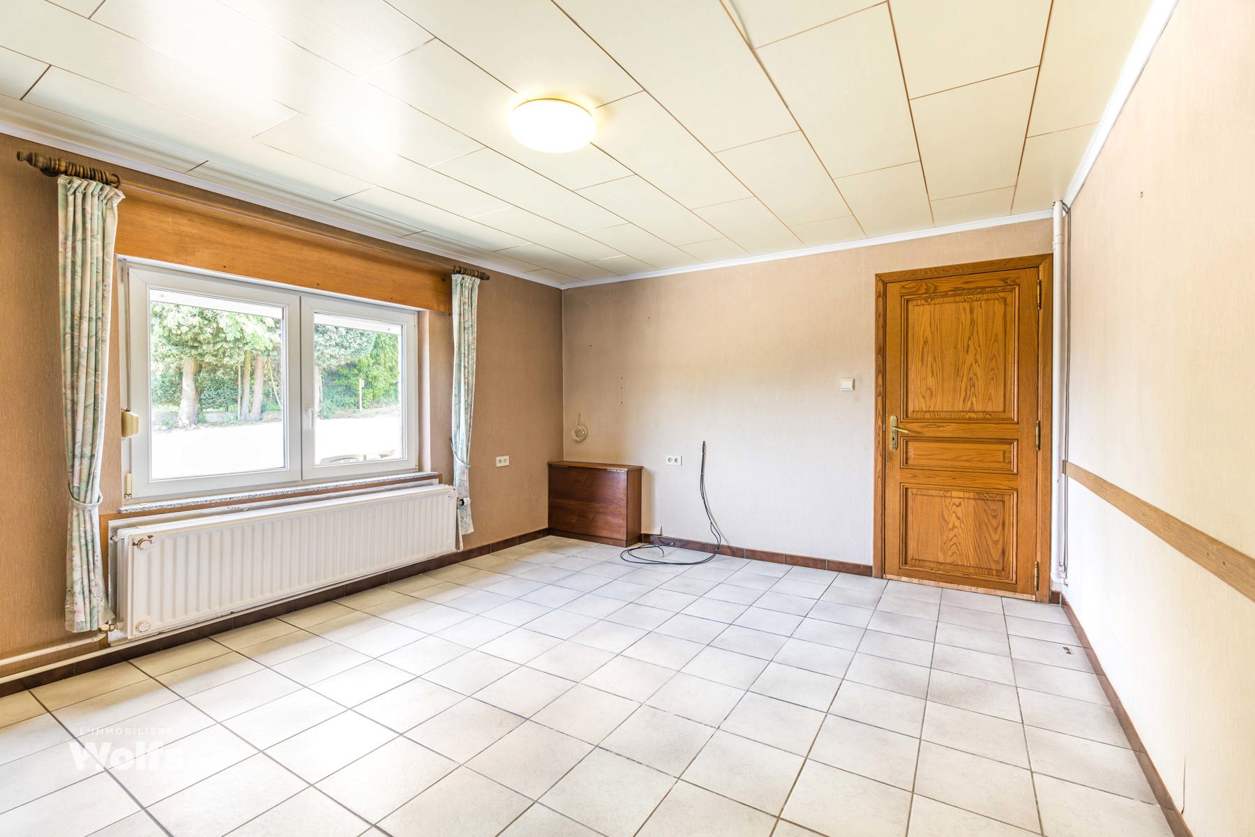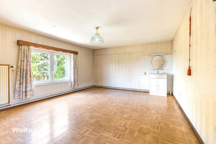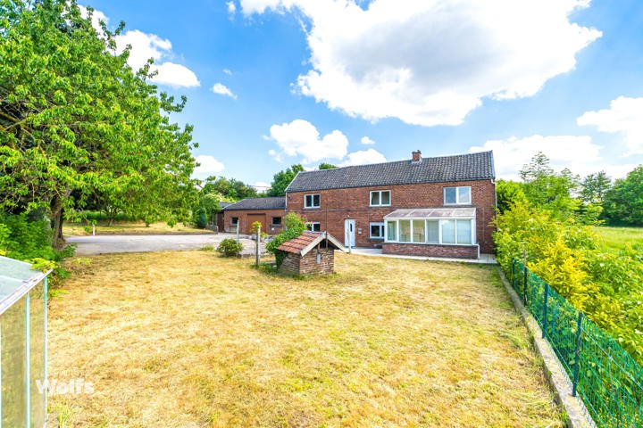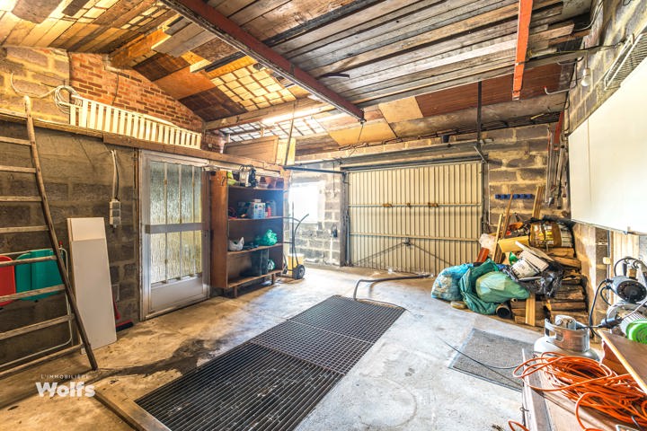Begane grond : woonkamer, eetkamer, ingerichte keuken, serre, bijkeuken, apart toilet, doucheruimte (douche, wastafel), een slaapkamer, stookruimte, garage, terras, tuin, aangrenzend weiland, parkeerplaats.