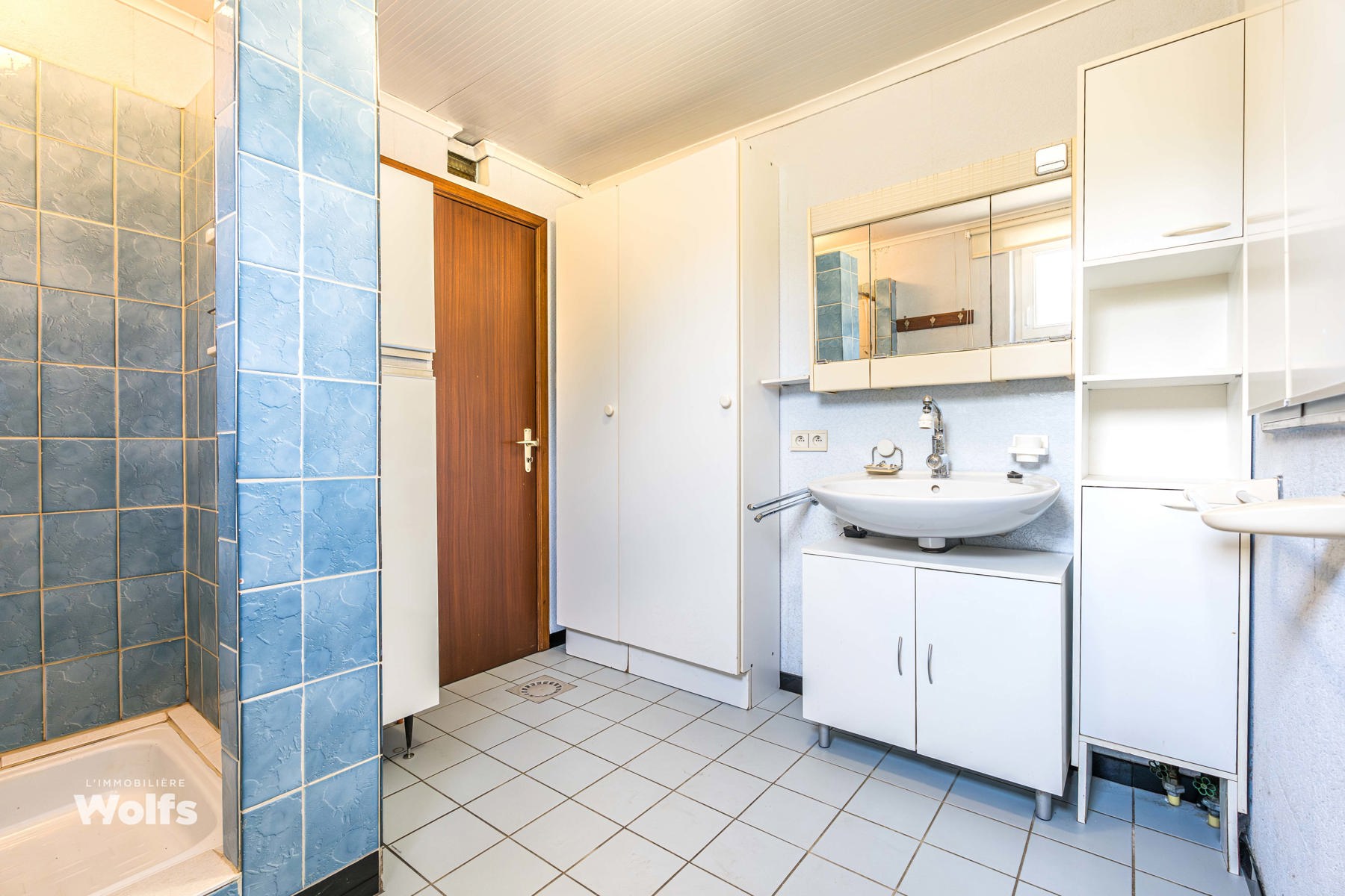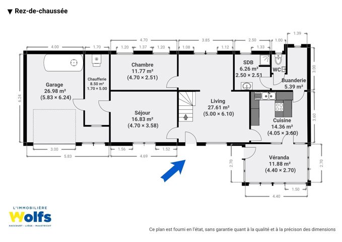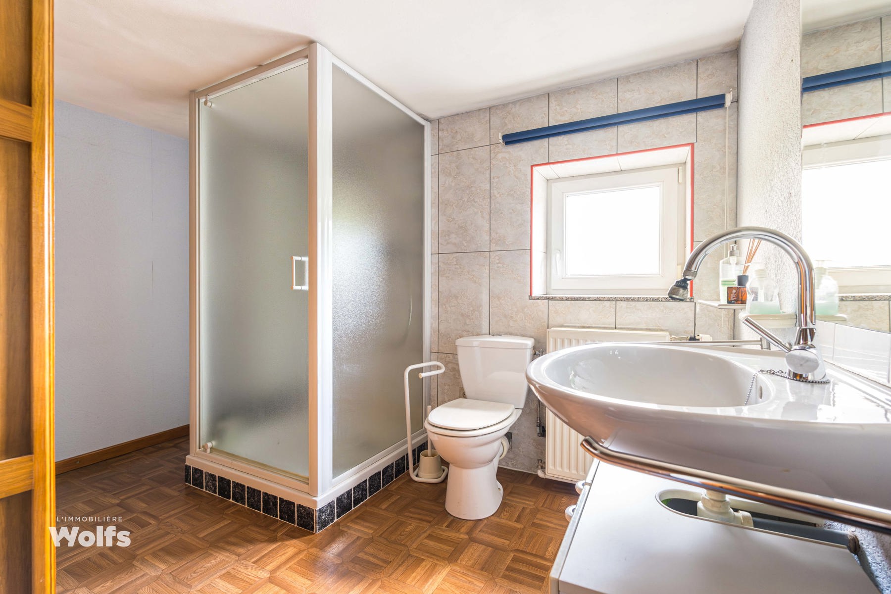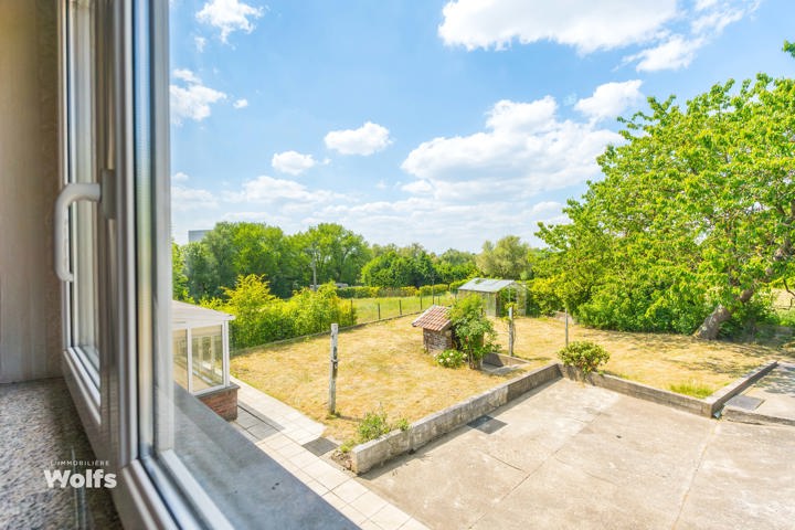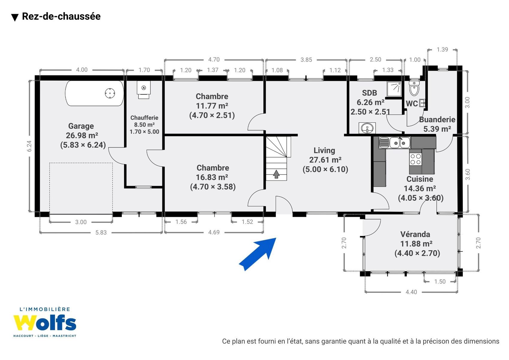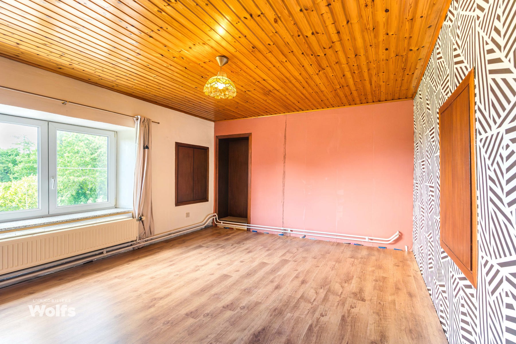 Begane grond : woonkamer, eetkamer, ingerichte keuken, serre, bijkeuken, apart toilet, doucheruimte (douche, wastafel), een slaapkamer, stookruimte, garage, terras, tuin, aangrenzend weiland, parkeerplaats.