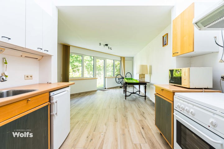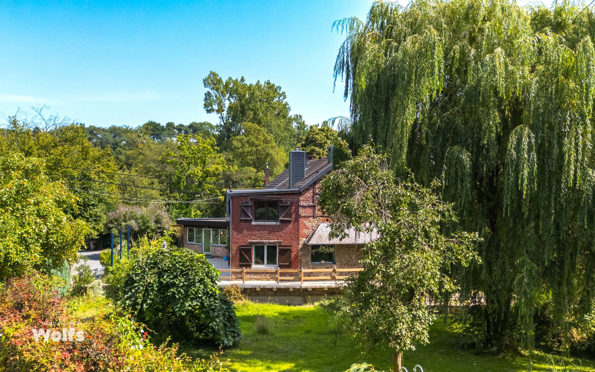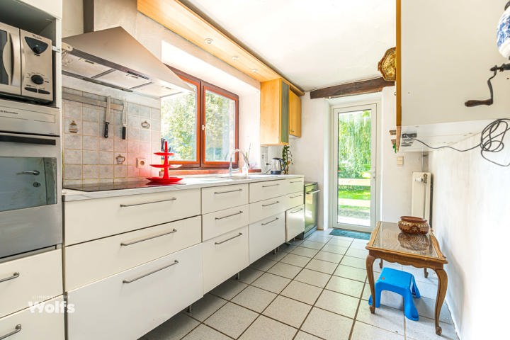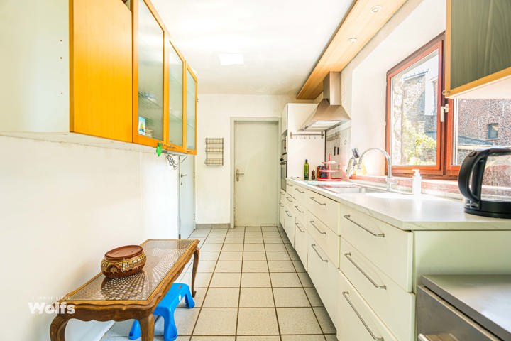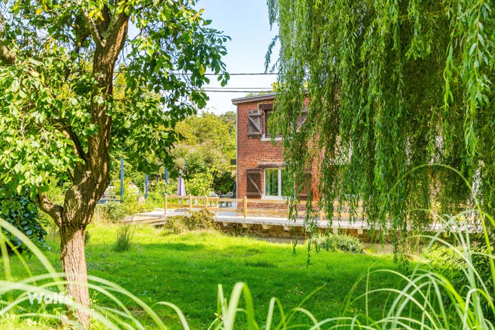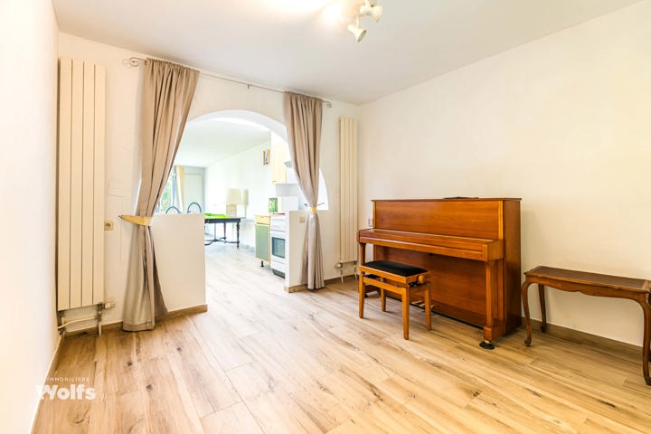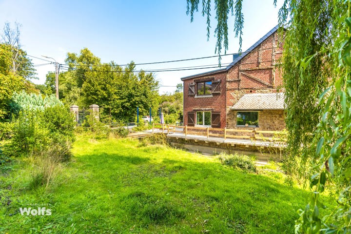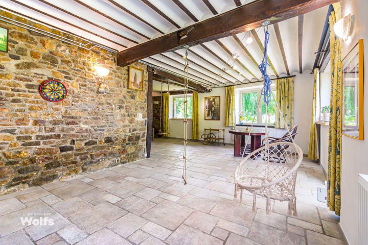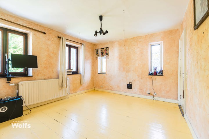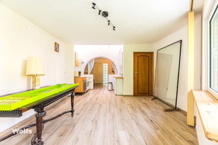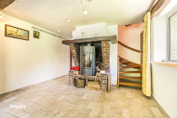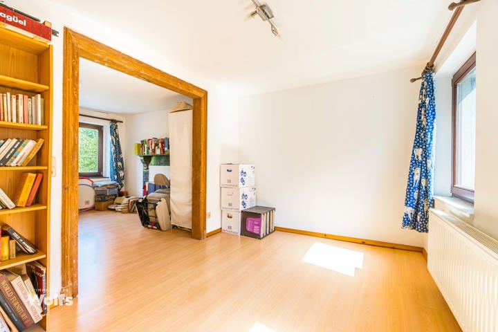 Begane grond : inkomhal, apart toilet, ruime leefruimte van +/- 44 m² met open haard en houtkachel, ingerichte keuken, kantoor, stookruimte, studio van +/- 33 m² bestaande uit een woonkamer, keuken en doucheruimte (wastafel, douche, bidet en toilet), terras, carport, parkeerplaats in de binnenplaats, charmante tuin met bomen (bouwgrond, onder voorbehoud van vergunning).