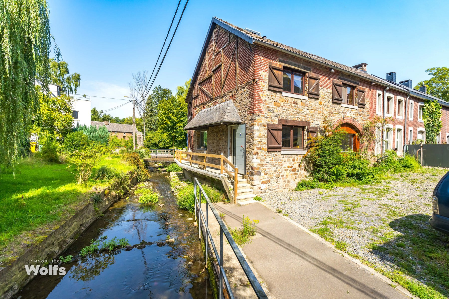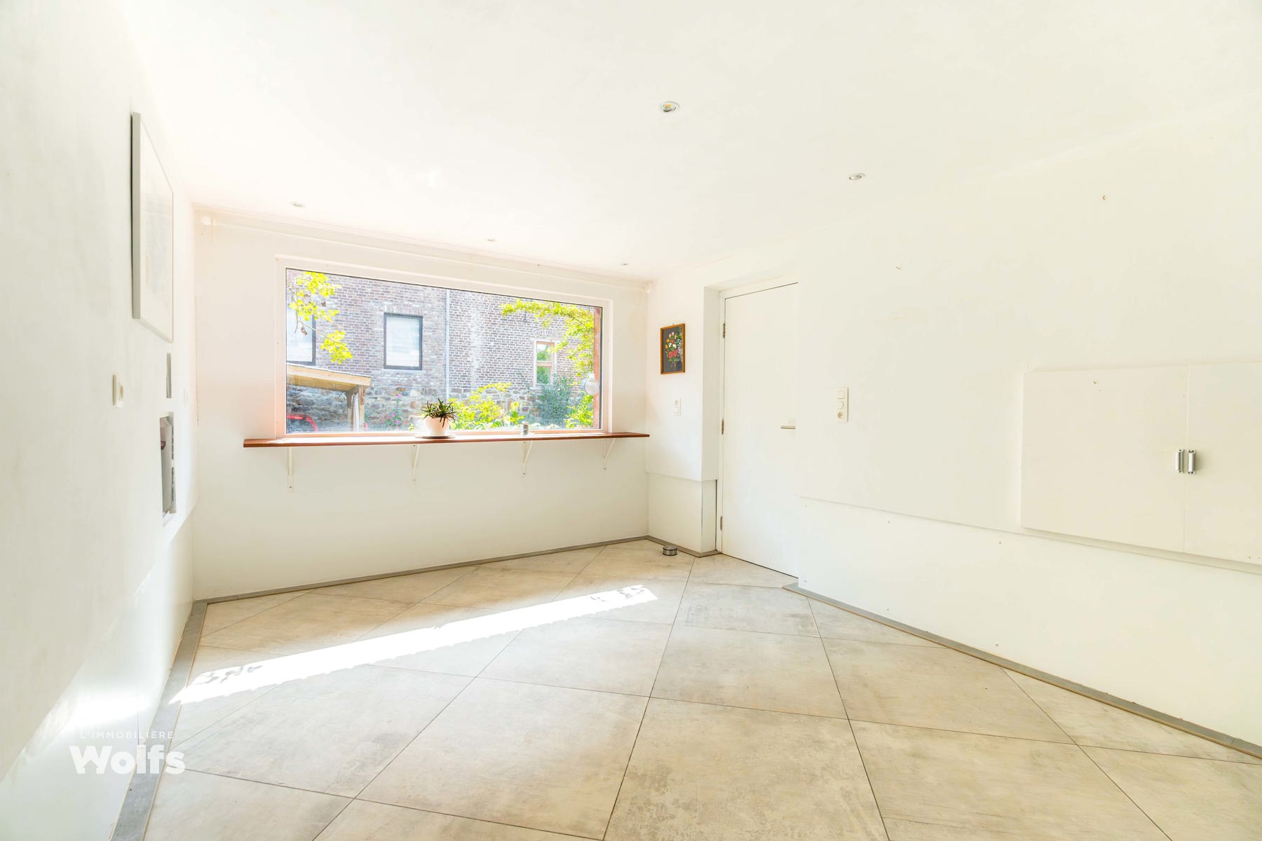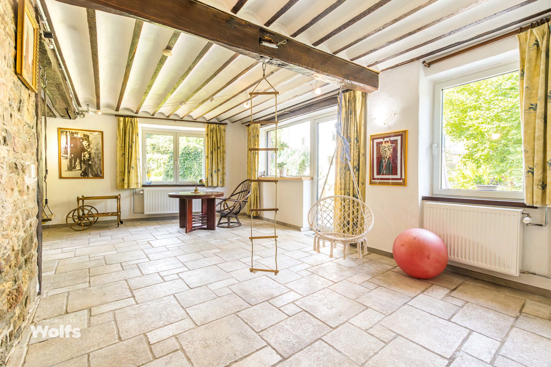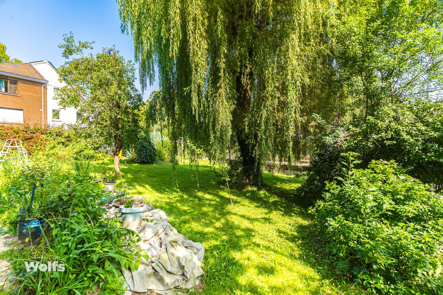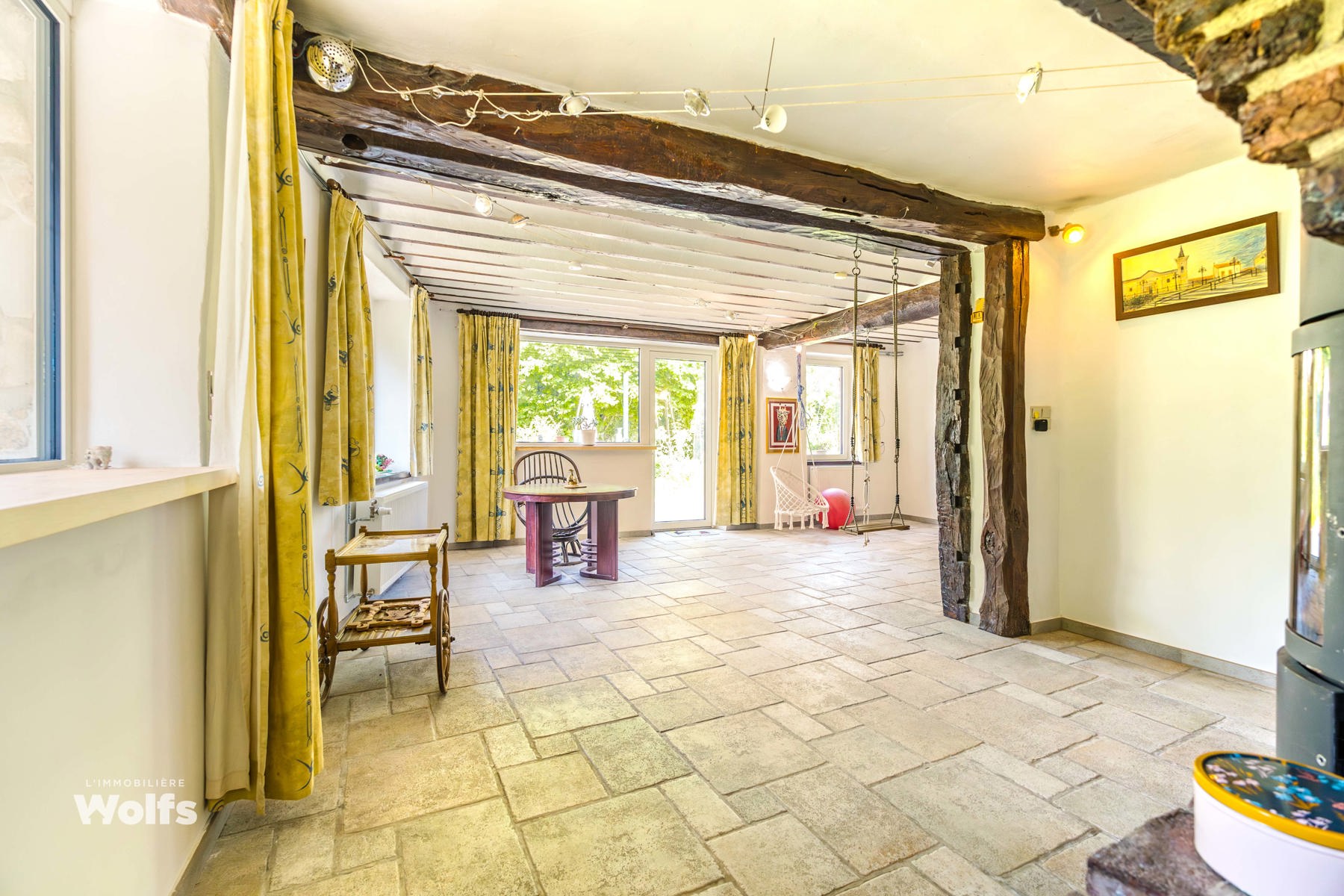 Begane grond : inkomhal, apart toilet, ruime leefruimte van +/- 44 m² met open haard en houtkachel, ingerichte keuken, kantoor, stookruimte, studio van +/- 33 m² bestaande uit een woonkamer, keuken en doucheruimte (wastafel, douche, bidet en toilet), terras, carport, parkeerplaats in de binnenplaats, charmante tuin met bomen (bouwgrond, onder voorbehoud van vergunning).