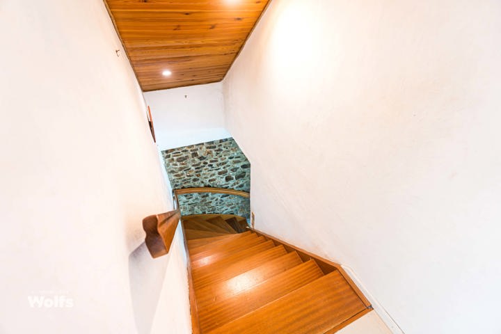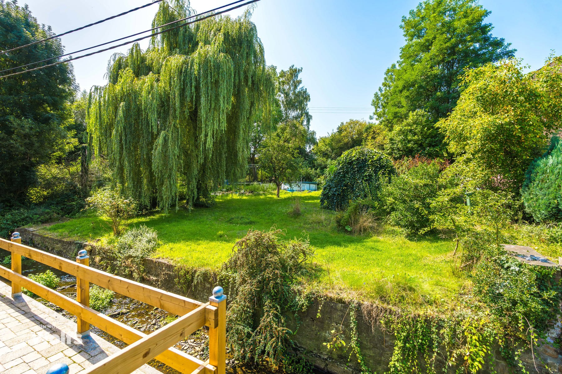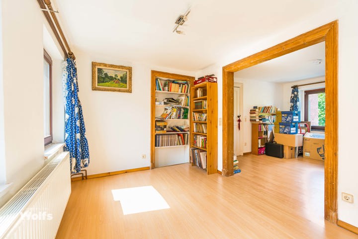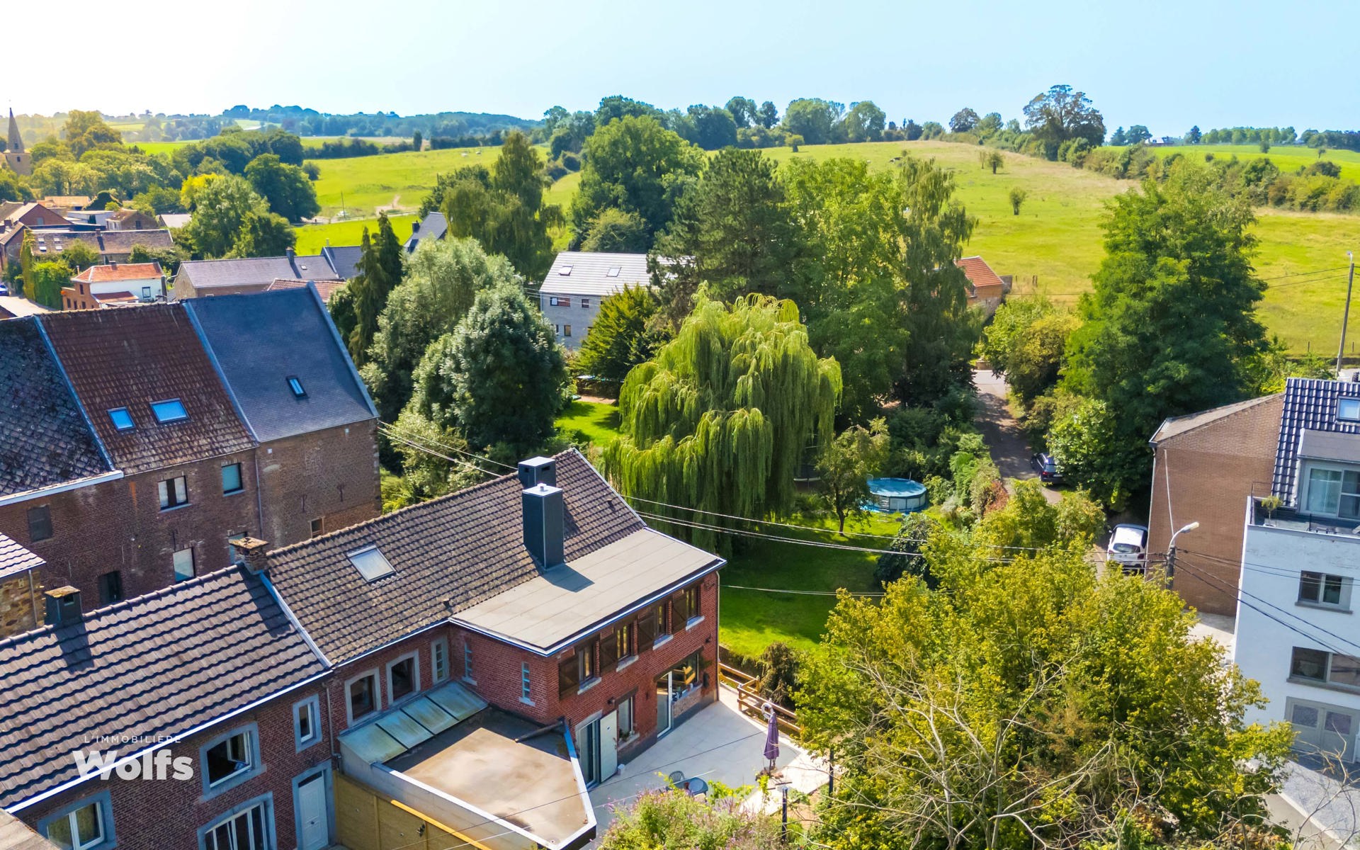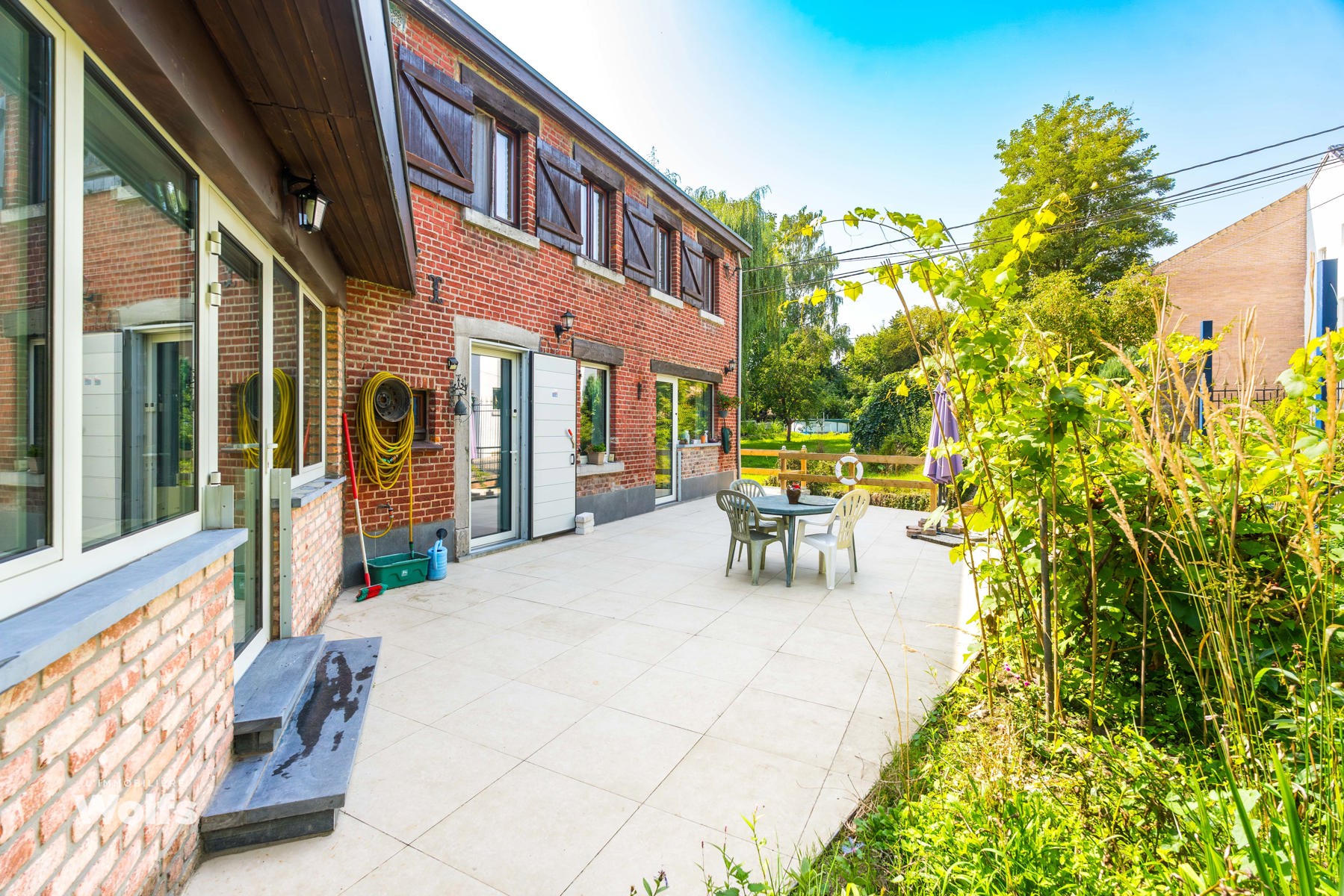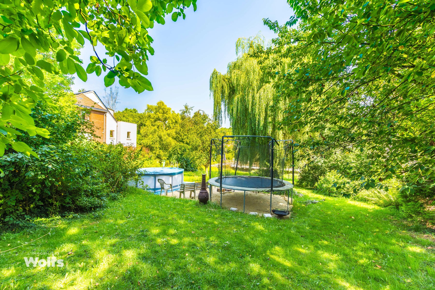 Begane grond : inkomhal, apart toilet, ruime leefruimte van +/- 44 m² met open haard en houtkachel, ingerichte keuken, kantoor, stookruimte, studio van +/- 33 m² bestaande uit een woonkamer, keuken en doucheruimte (wastafel, douche, bidet en toilet), terras, carport, parkeerplaats in de binnenplaats, charmante tuin met bomen (bouwgrond, onder voorbehoud van vergunning).
