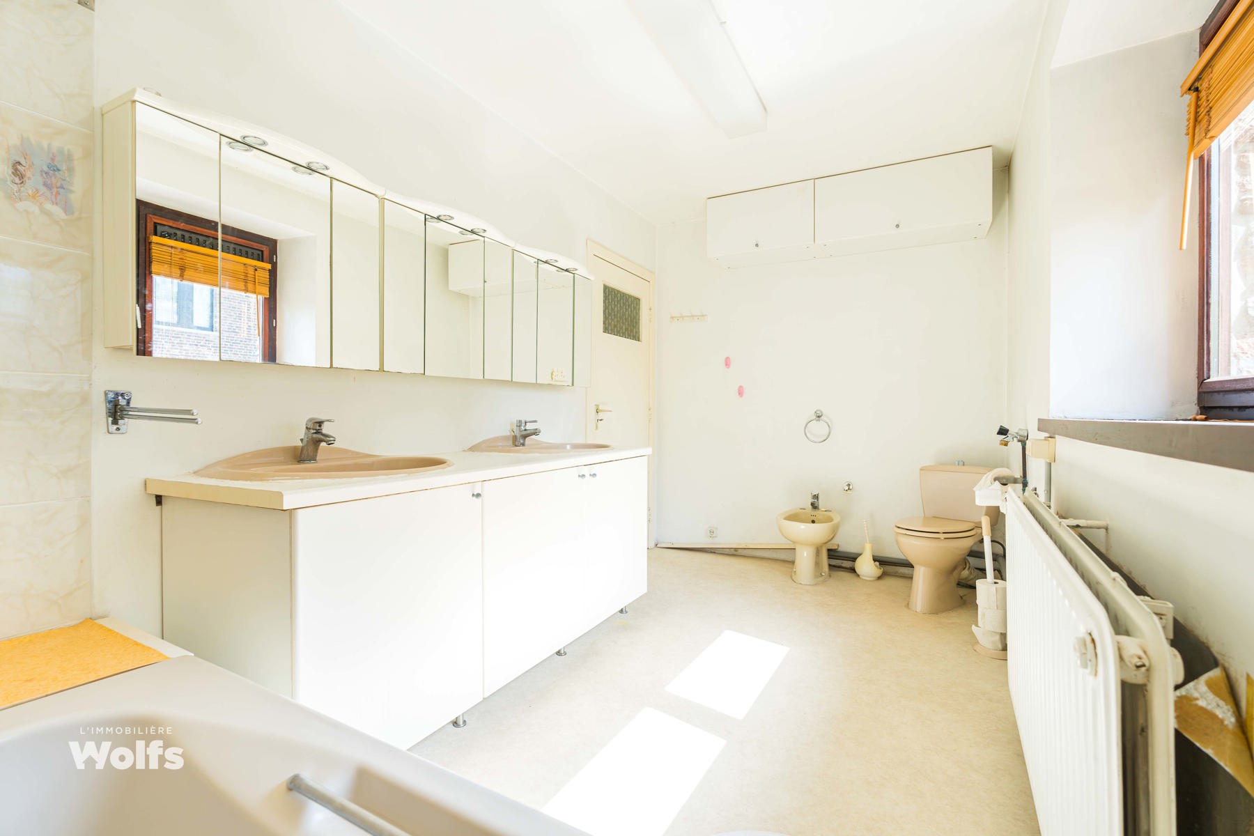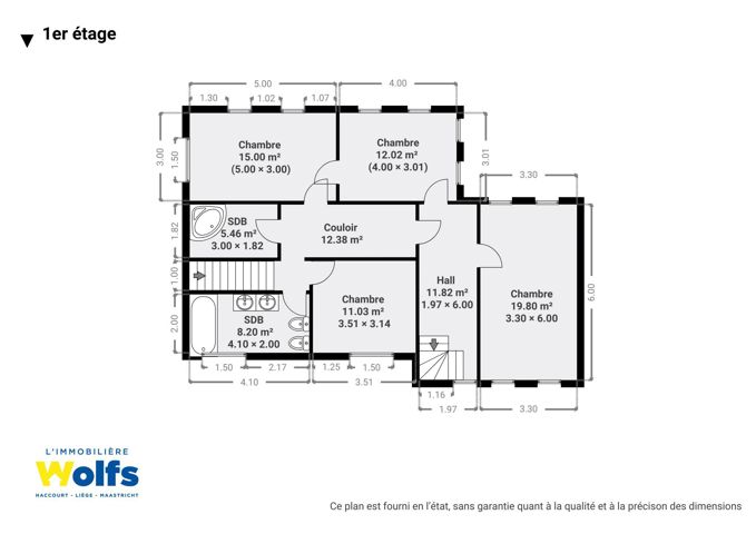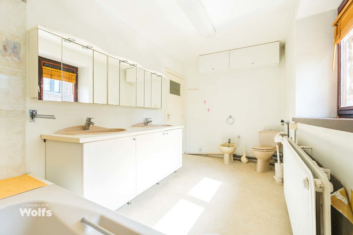 Verdieping : nachthal van +/- 24 m², vier slaapkamers van +/- 11, 12, 15 en 20 m², een badkamer met ligbad en een toilet (dubbele wastafel, ligbad, bidet en toilet)