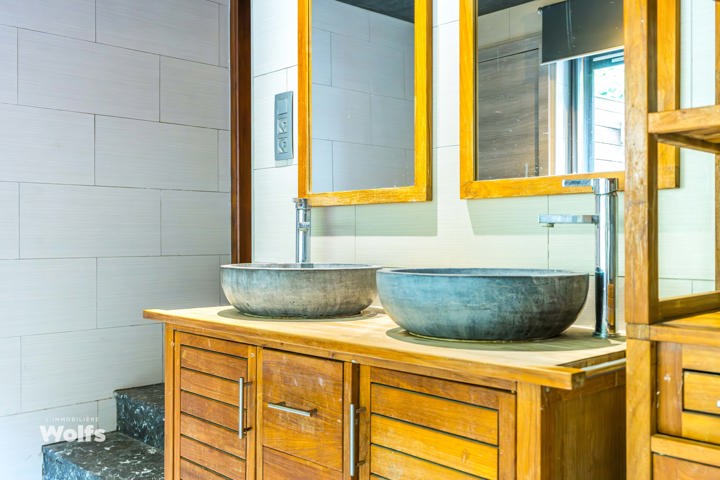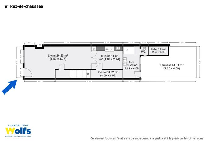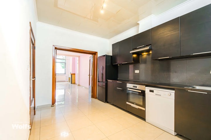 Gelijkvloers : lichte woonkamer van +/- 30 m², ingerichte keuken van +/- 12 m², lange gang, doucheruimte (dubbele wastafel, toilet en douche), ruim terras met werkruimte en tuin.
