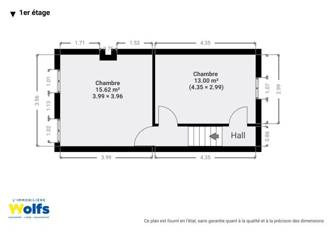 1e verdieping : nachthal, twee grote slaapkamers van +/- 13 en 16 m².