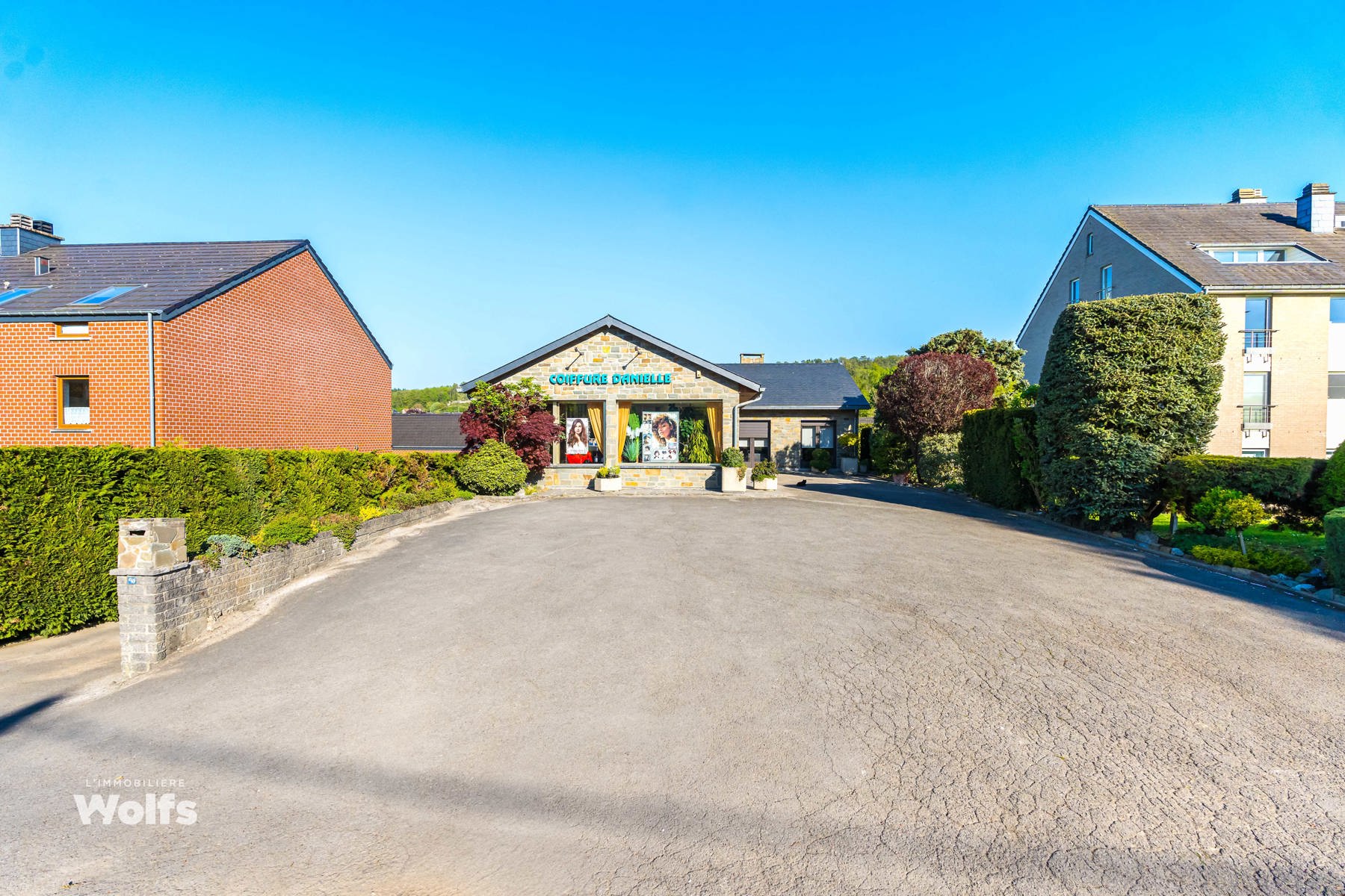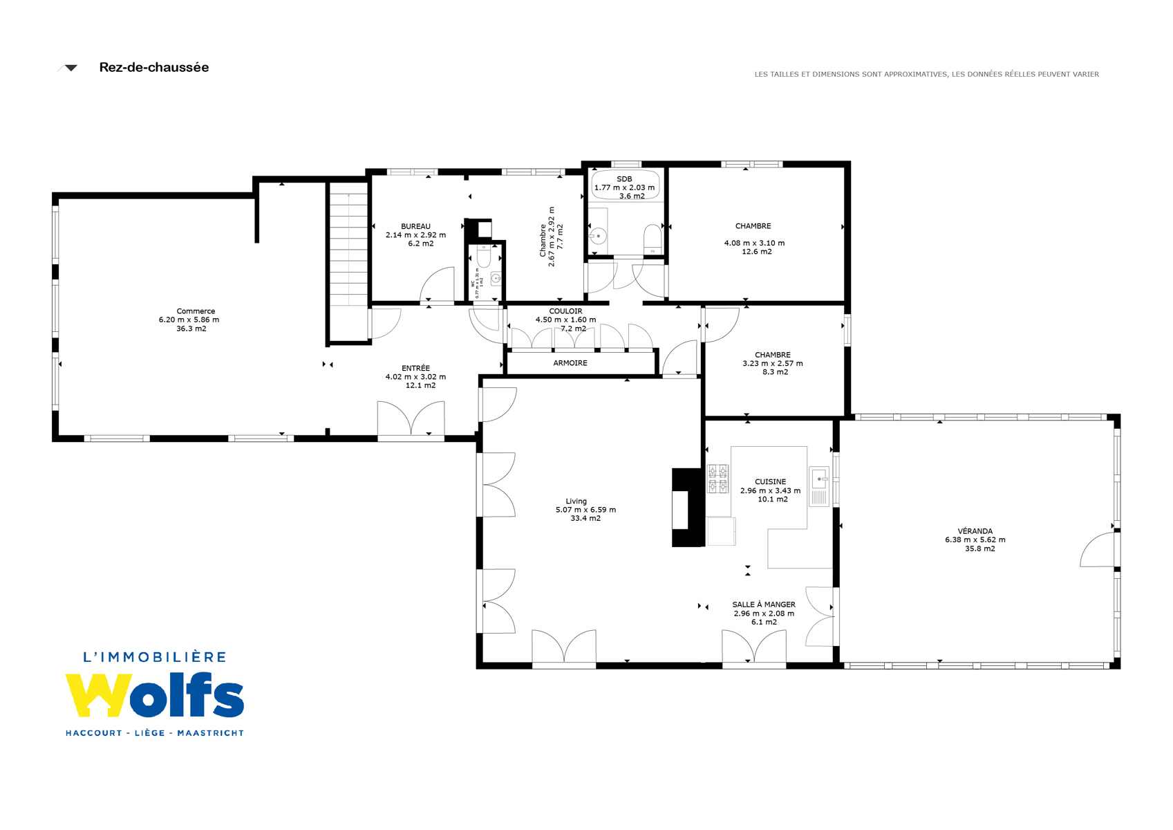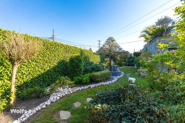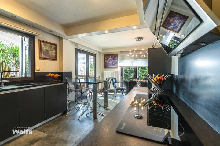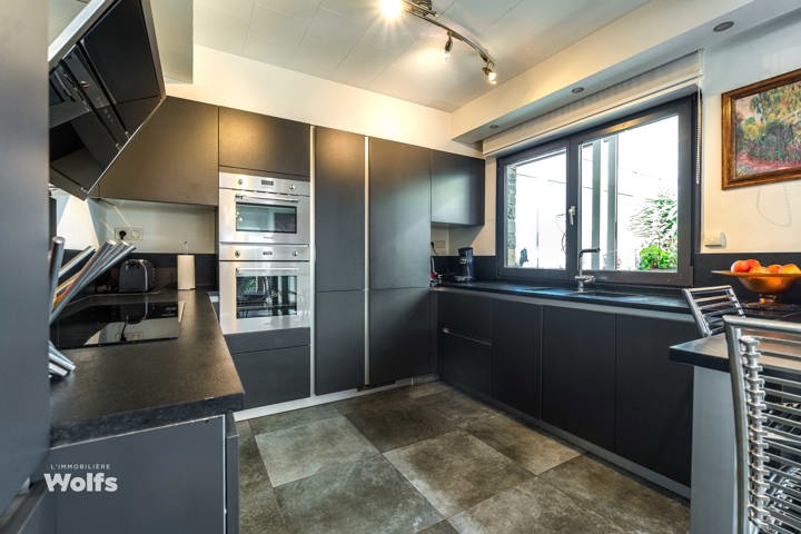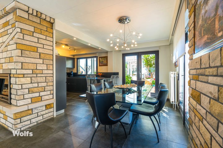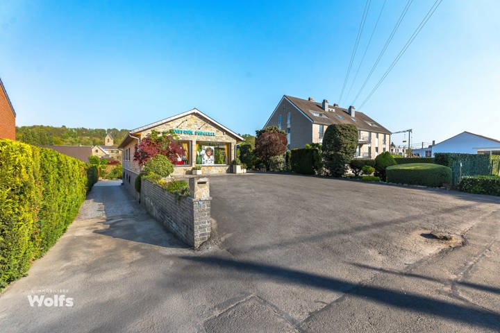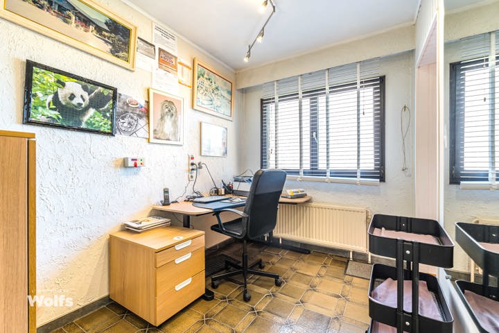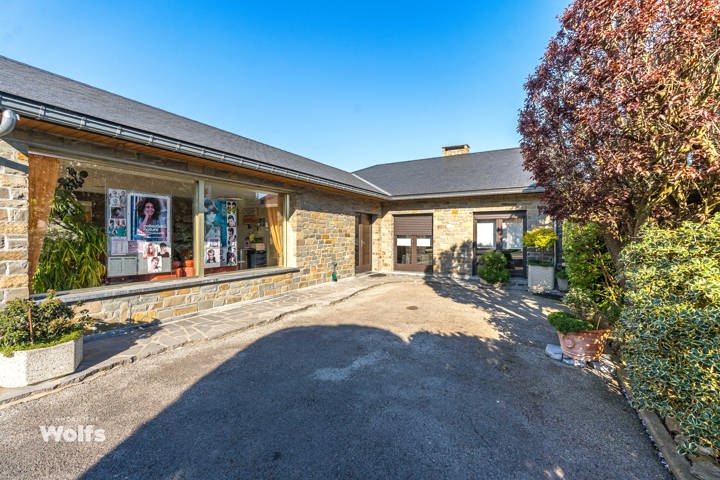 Rez-de-chaussée : partie commerce de +/- 36 m², toilette indépendante, living de +/- 50 m² (salon, salle à manger) avec cuisine équipée ouverte, superbe véranda de +/- 35 m², hall de nuit, bureau, trois chambres, salle de bains (baignoire, lavabo, toilette), terrasse, jardin aménagé, parking en façade.