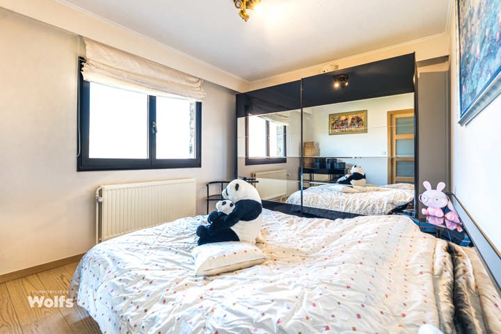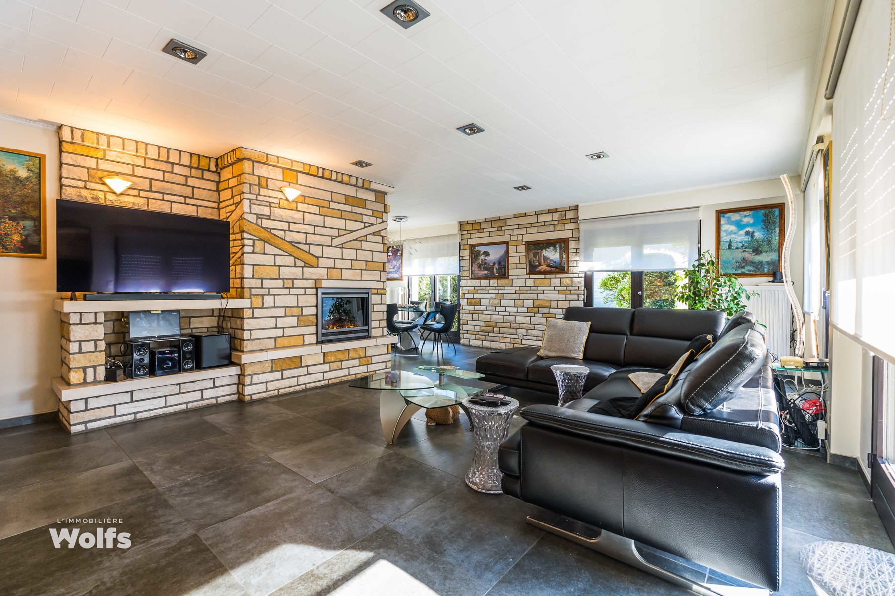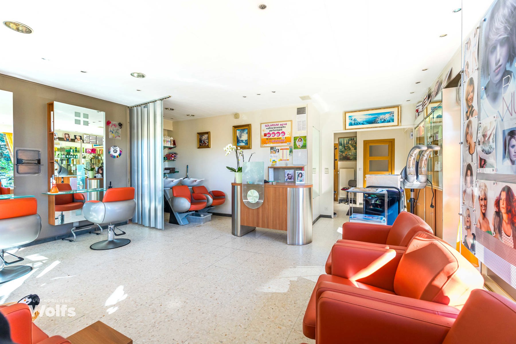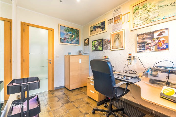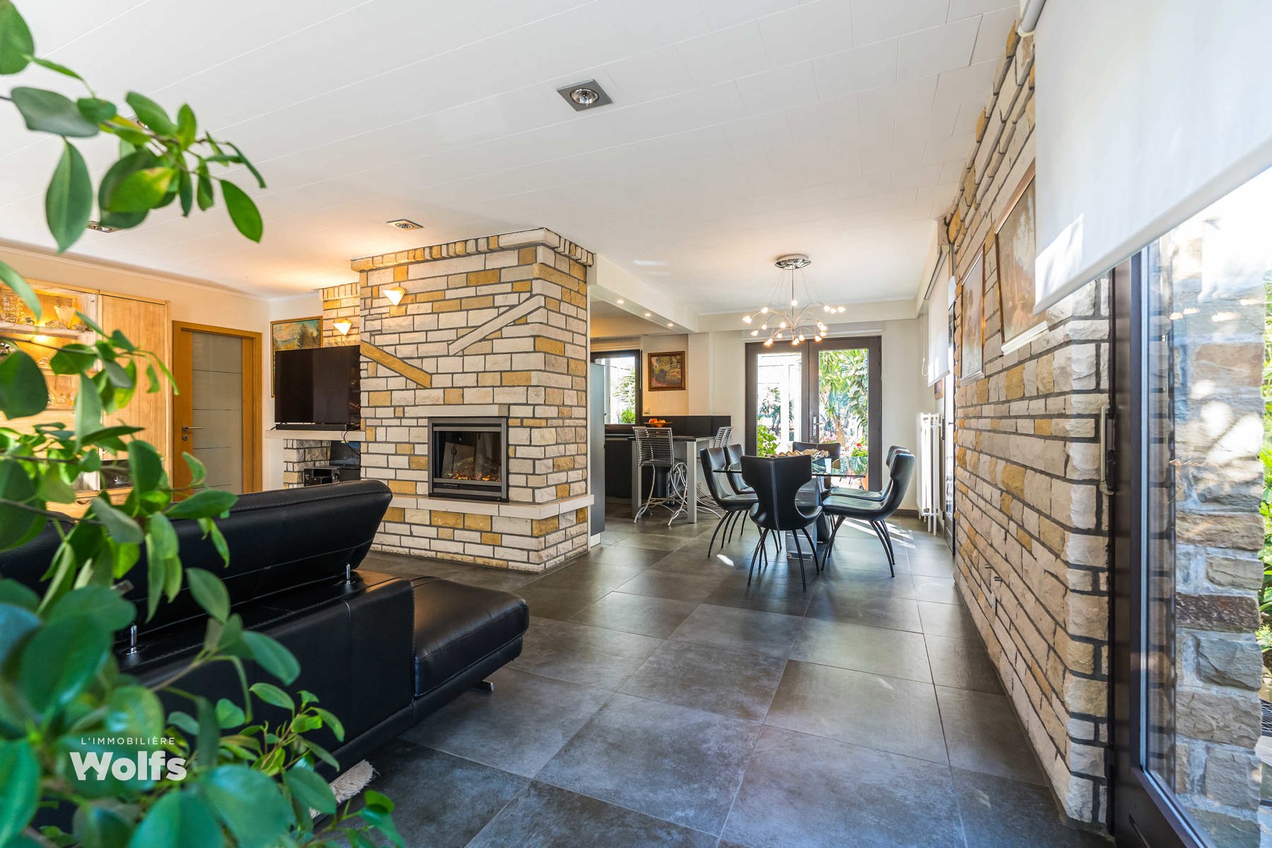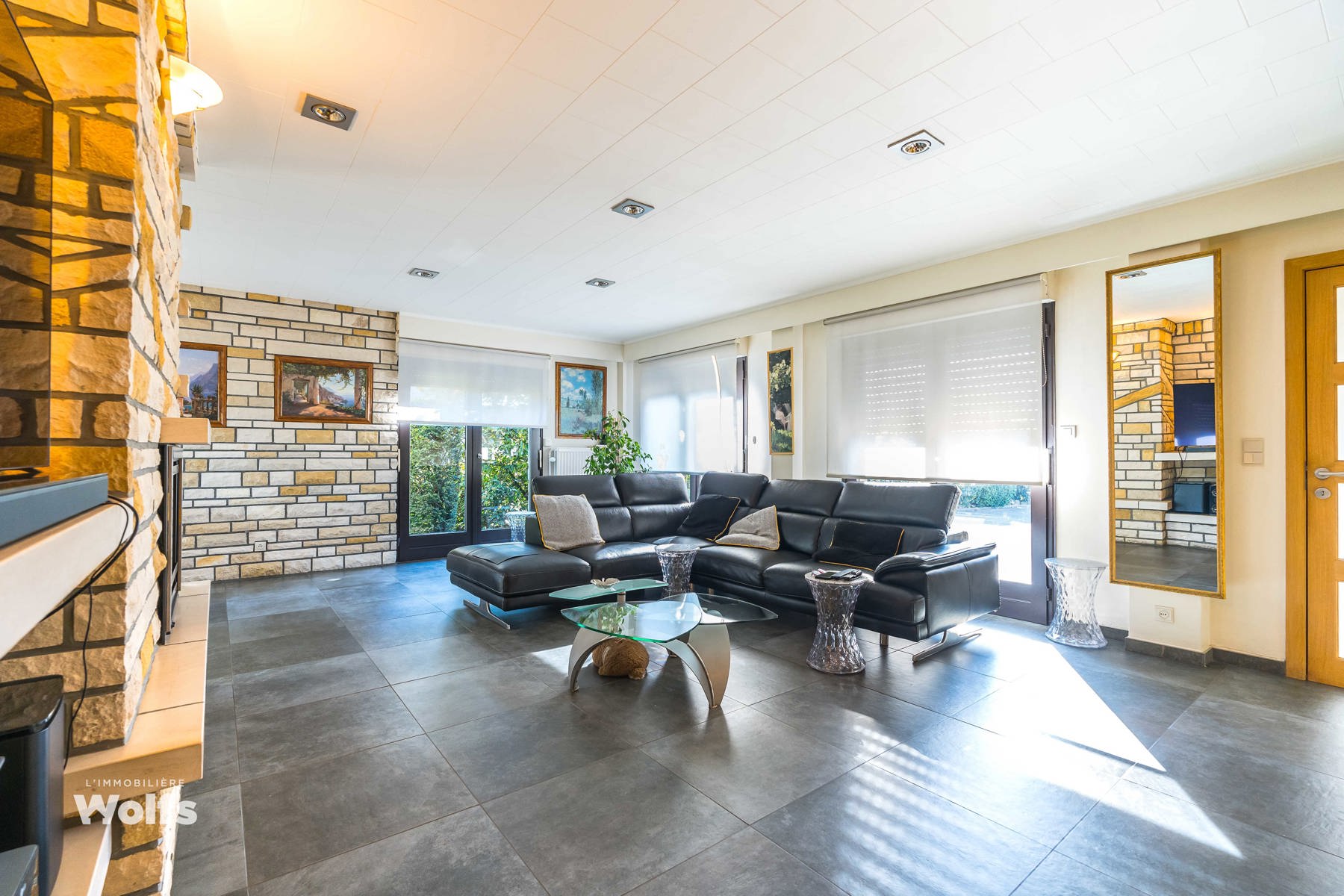 Rez-de-chaussée : partie commerce de +/- 36 m², toilette indépendante, living de +/- 50 m² (salon, salle à manger) avec cuisine équipée ouverte, superbe véranda de +/- 35 m², hall de nuit, bureau, trois chambres, salle de bains (baignoire, lavabo, toilette), terrasse, jardin aménagé, parking en façade.