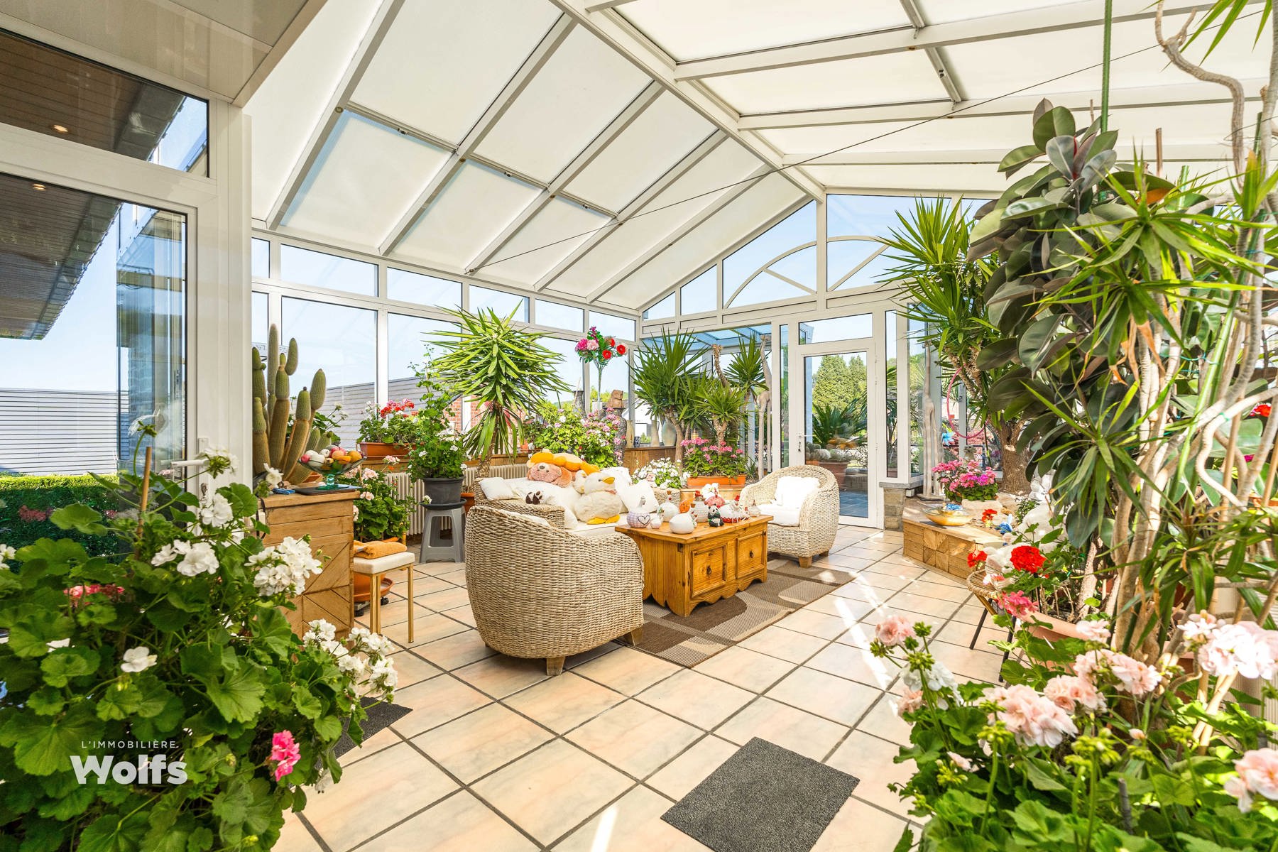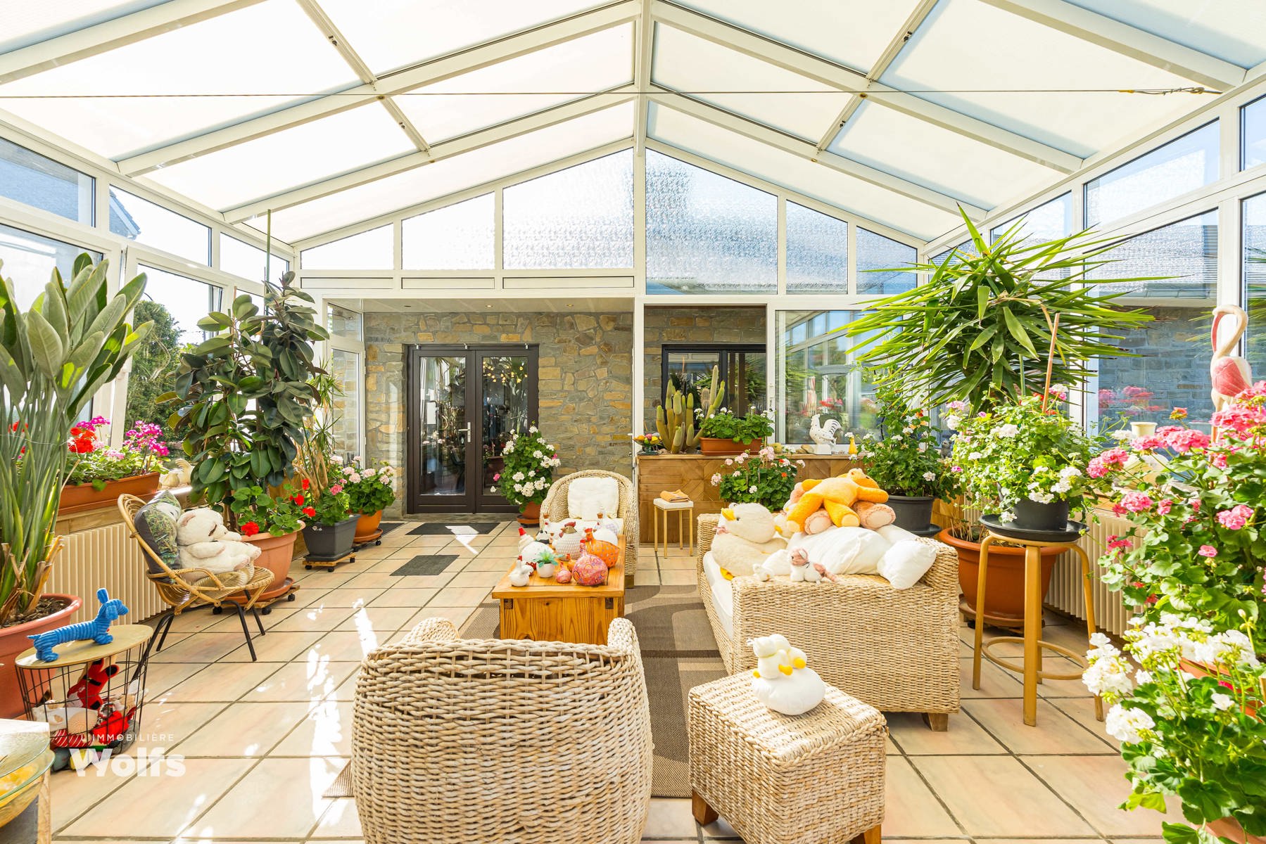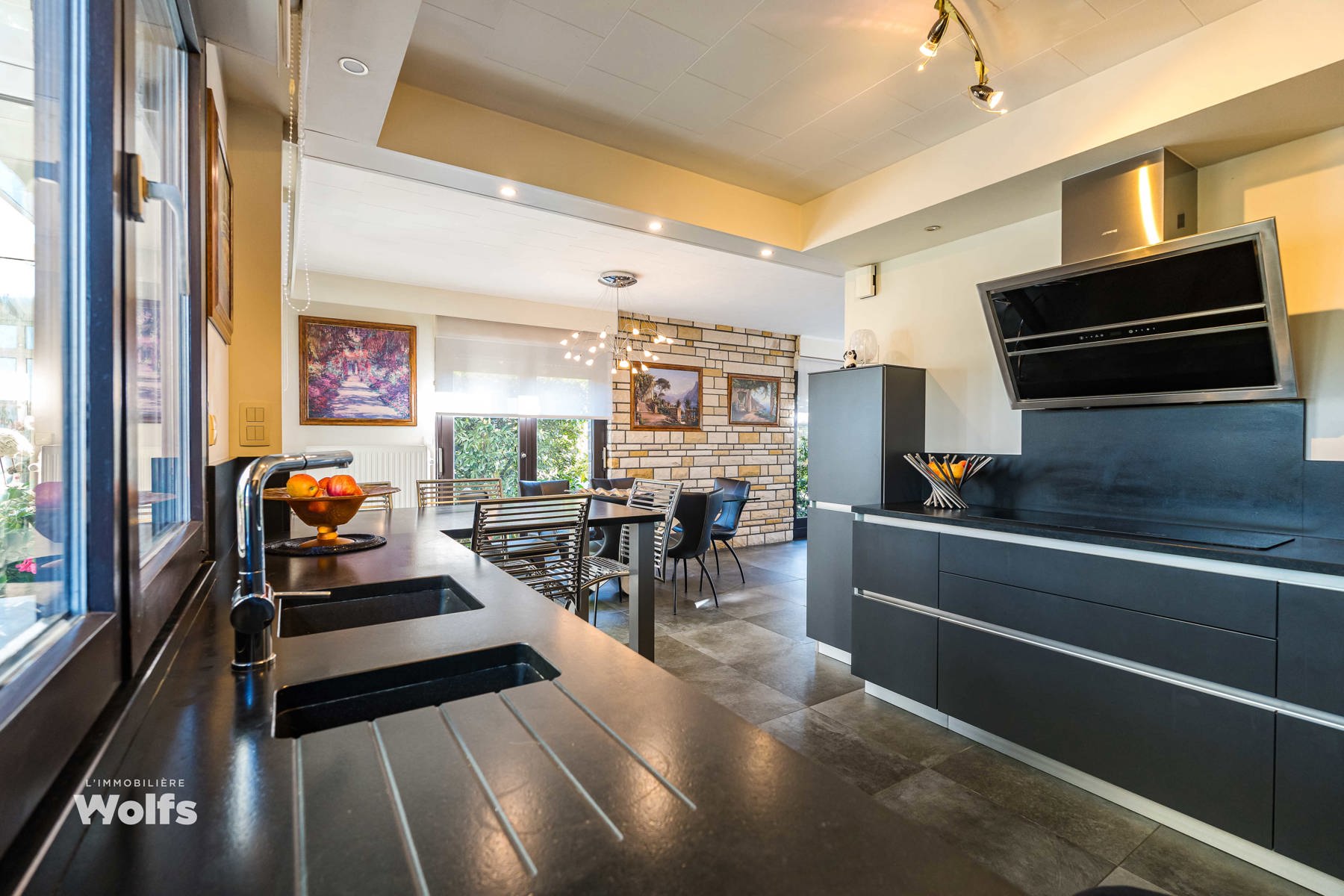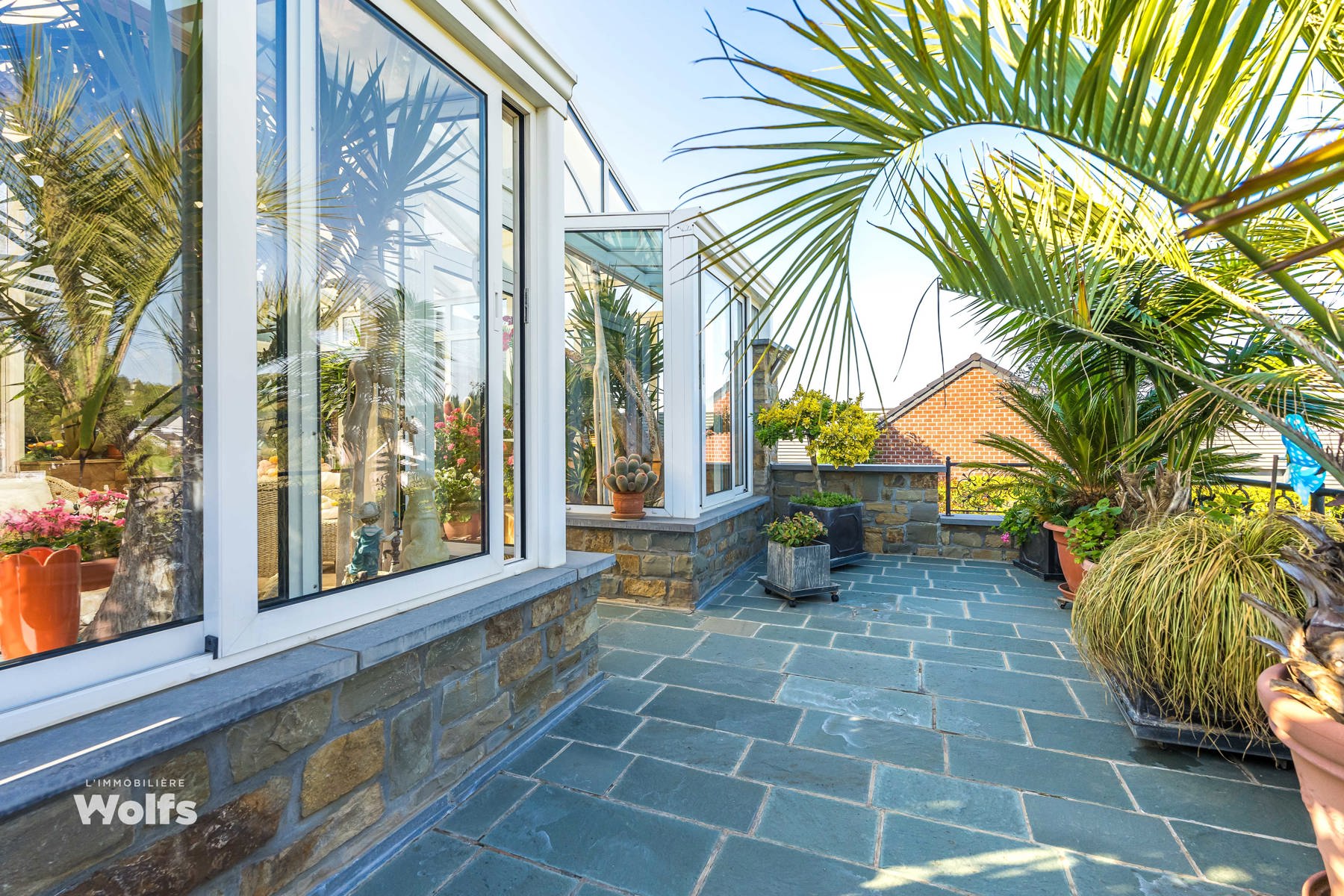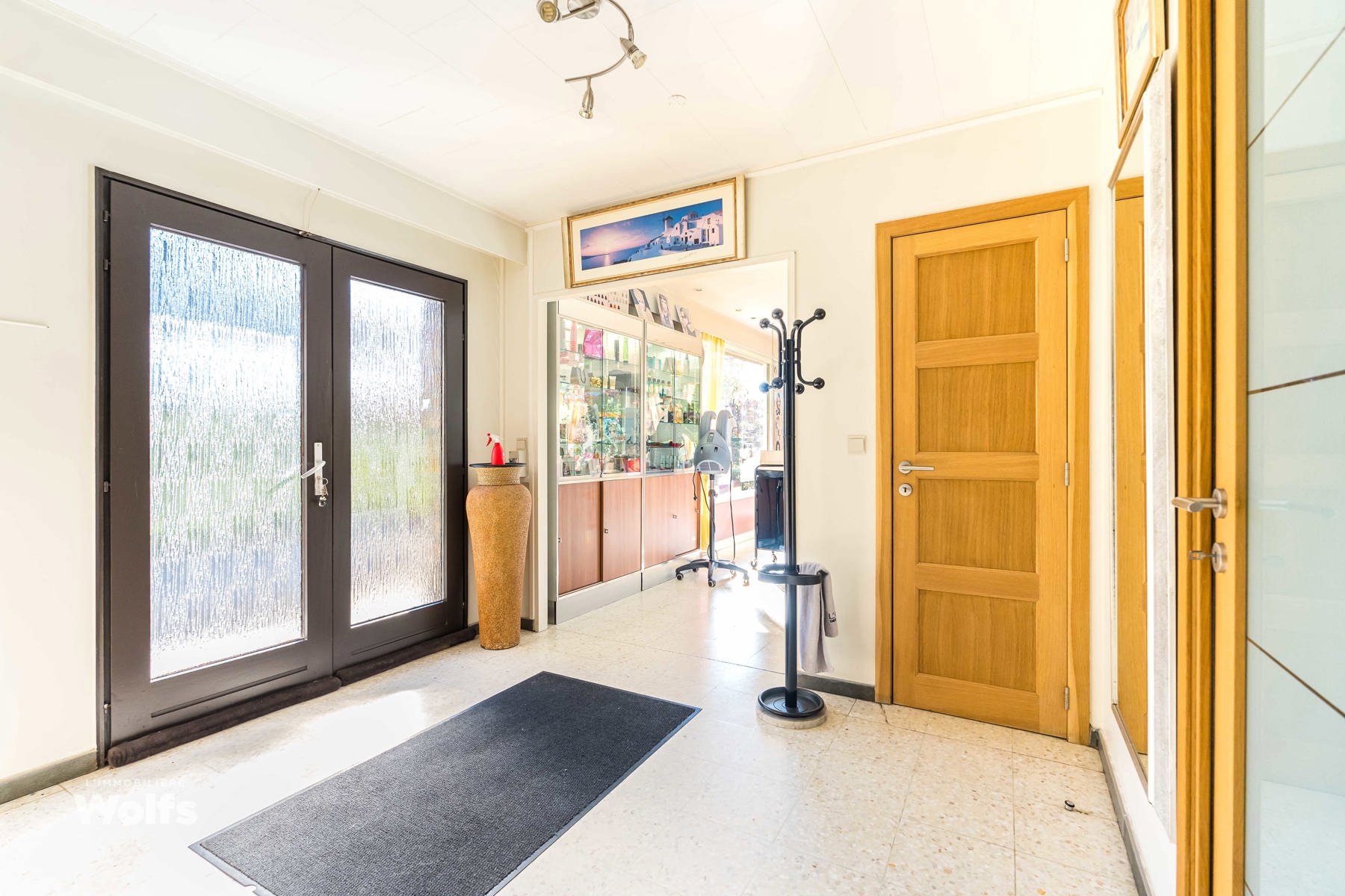 Rez-de-chaussée : partie commerce de +/- 36 m², toilette indépendante, living de +/- 50 m² (salon, salle à manger) avec cuisine équipée ouverte, superbe véranda de +/- 35 m², hall de nuit, bureau, trois chambres, salle de bains (baignoire, lavabo, toilette), terrasse, jardin aménagé, parking en façade.