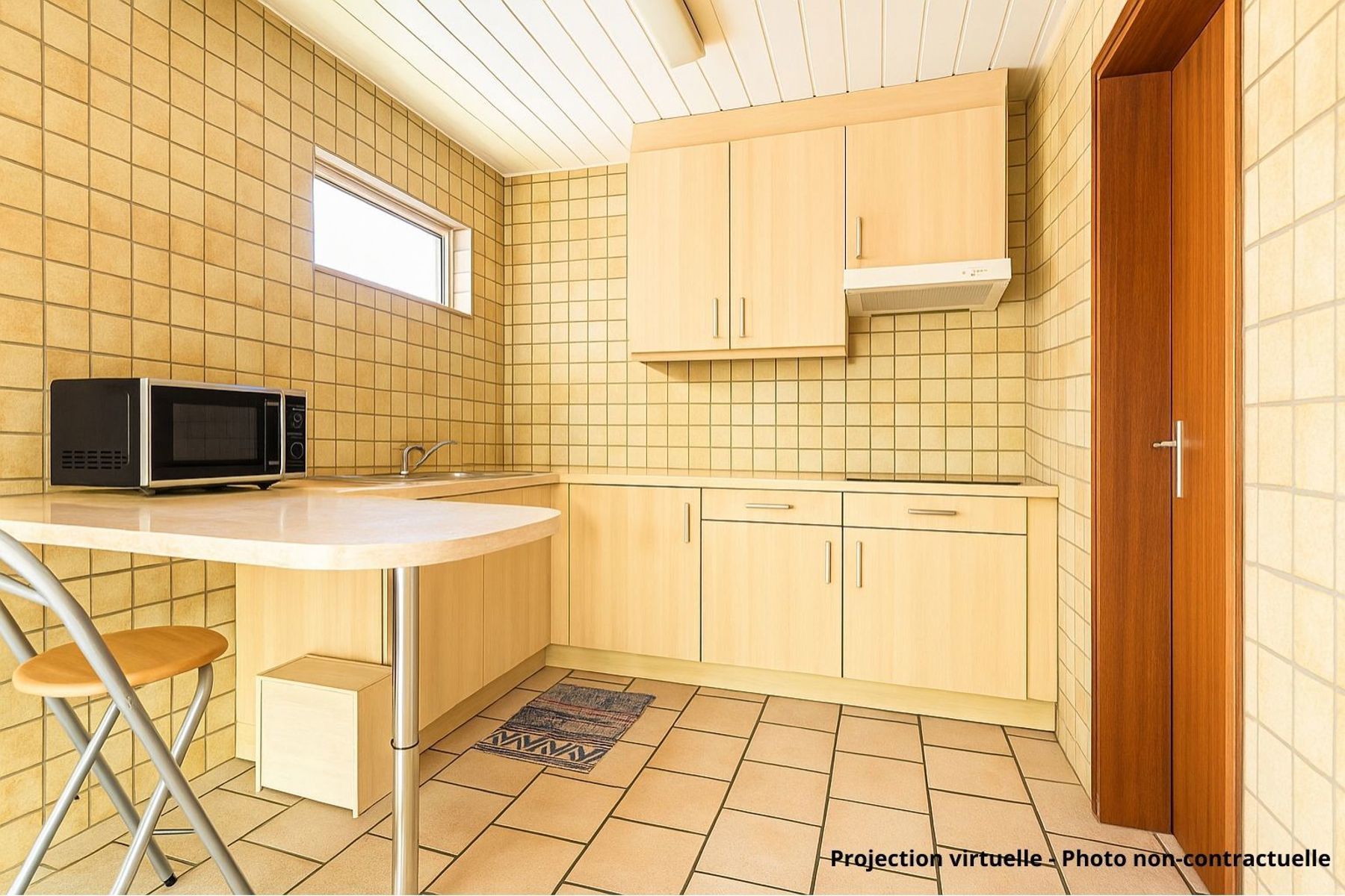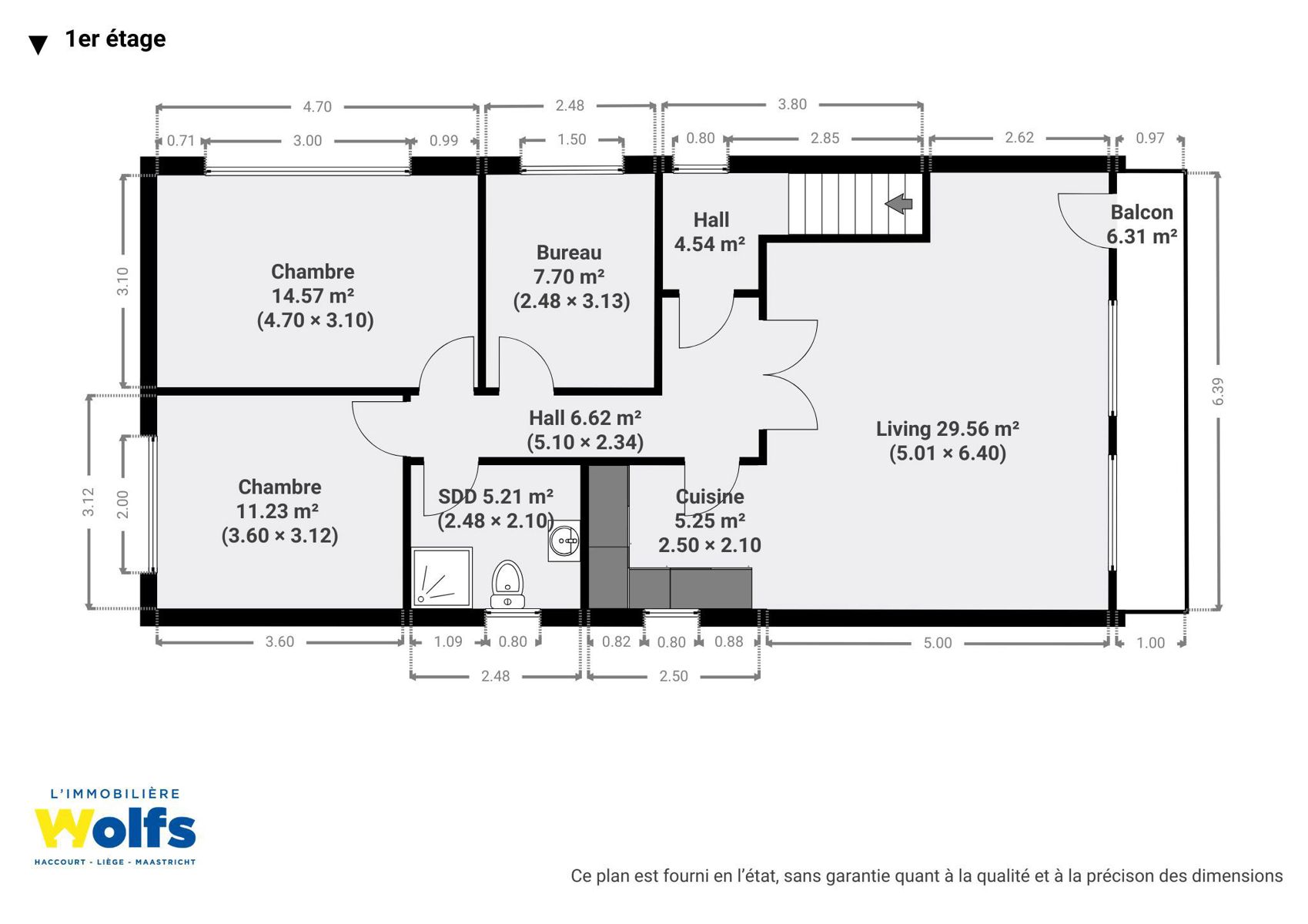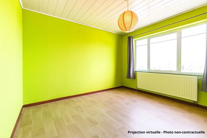 1er étage : hall d'entrée, spacieux living et baigné de lumière de +/- 35 m² avec cuisine ouverte et accès au balcon, deux chambres confortables de +/- 11 et 14 m², un bureau ou petite chambre de +/- 8 m², salle de bains (lavabo, douche, toilette).