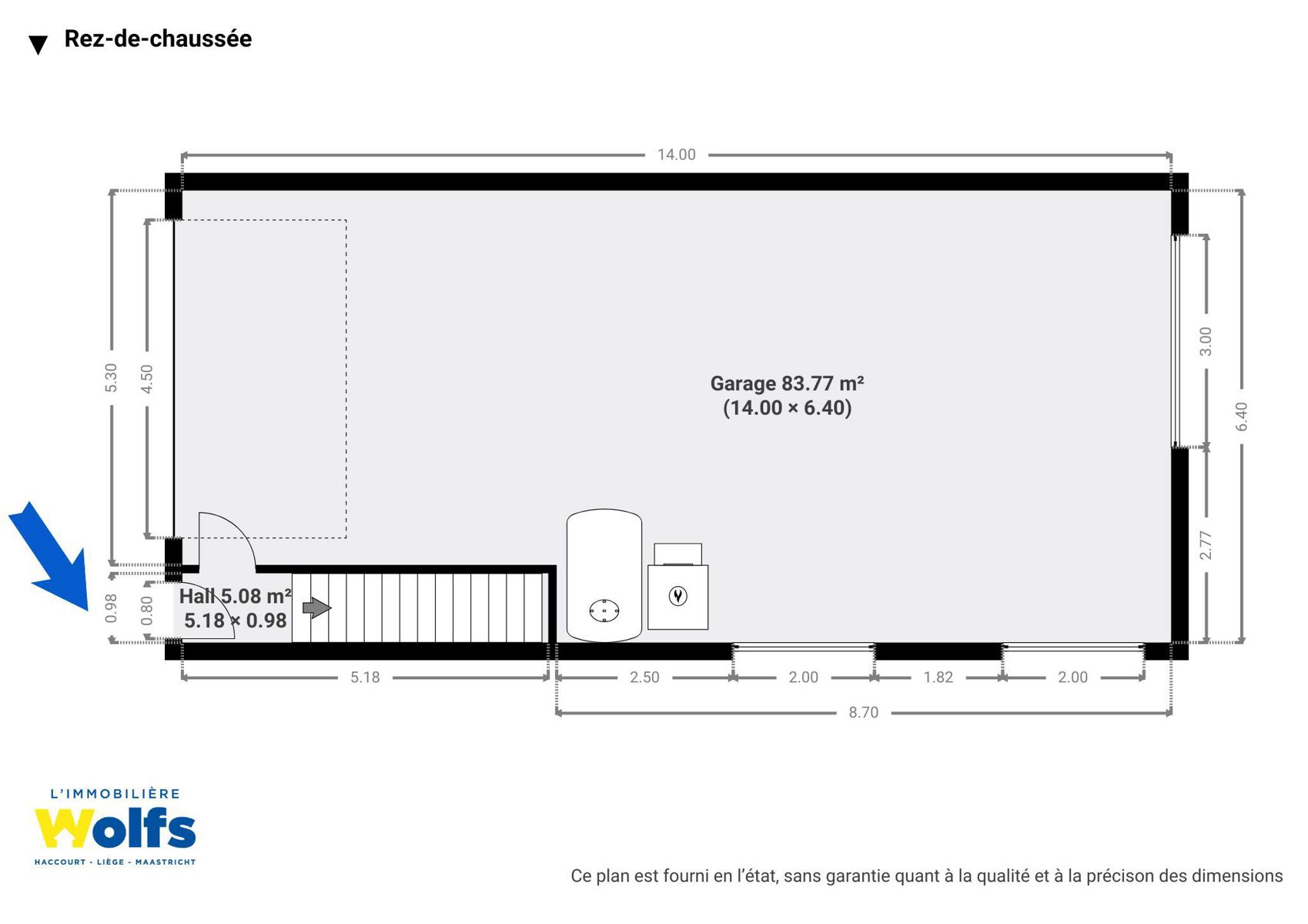Rez-de-chaussée : grande allée, une première entrée donnant accès au garage de +/- 84 m², permettant de stationner plusieurs véhicules, de créer un atelier ou de disposer d’un vaste espace de rangement. une seconde entrée indépendante donnant accès à un lumineux appartement, joli jardin.