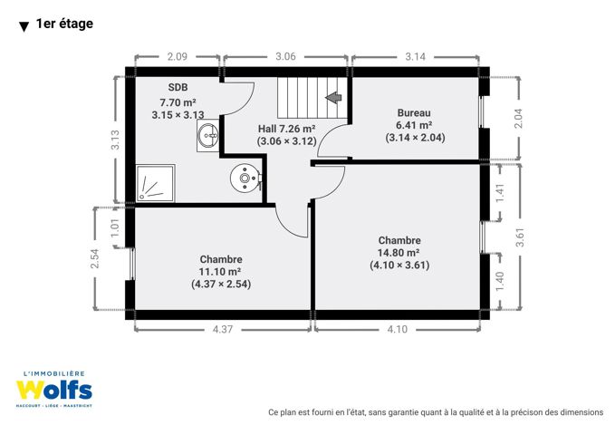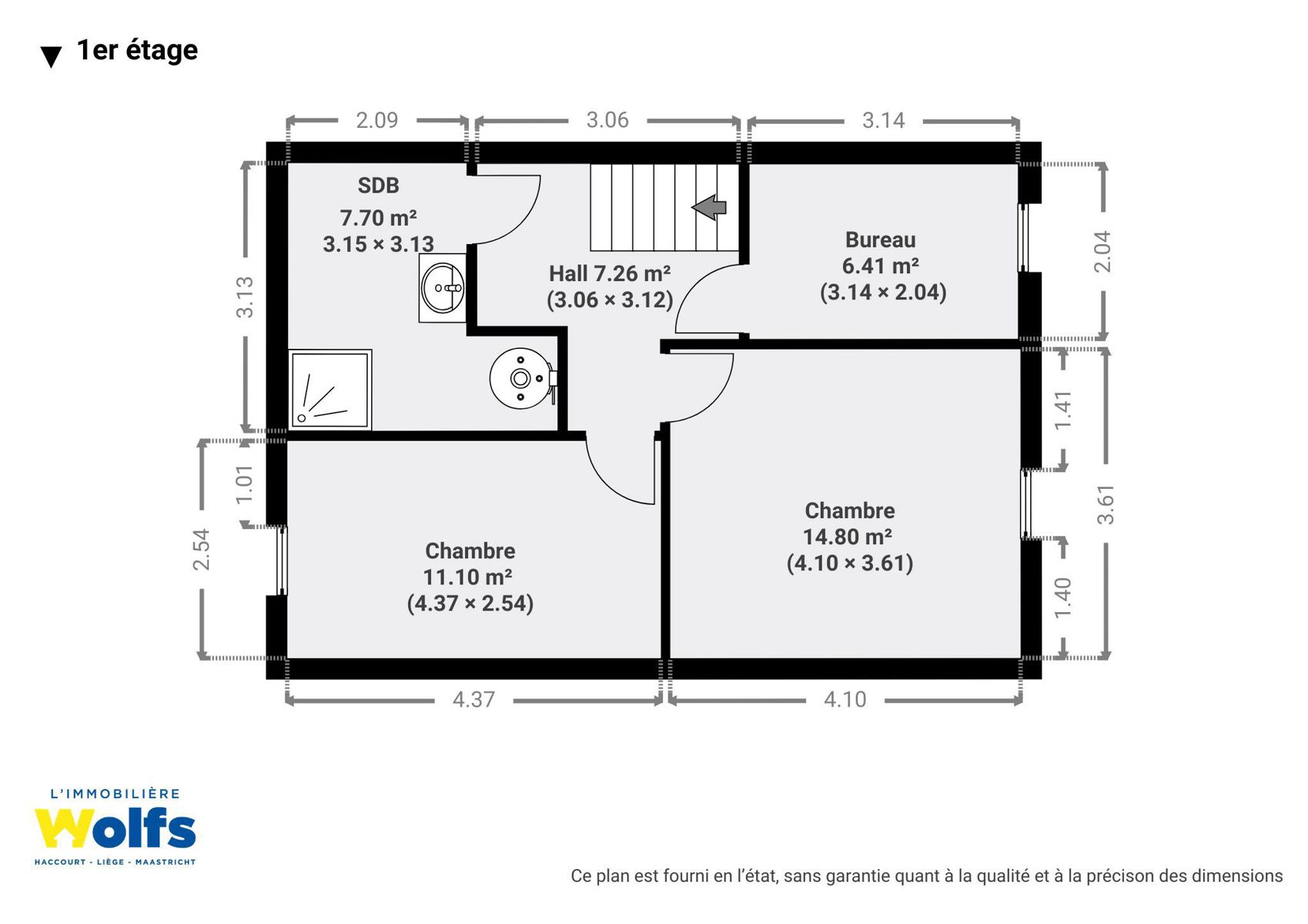 Eerste verdieping : nachthal, twee slaapkamers van ongeveer 10 en 15 m², doucheruimte (wastafel, douche en toilet), kleine studeer- of kleedkamer, te creëren toegang tot de inrichtbare zolder.
