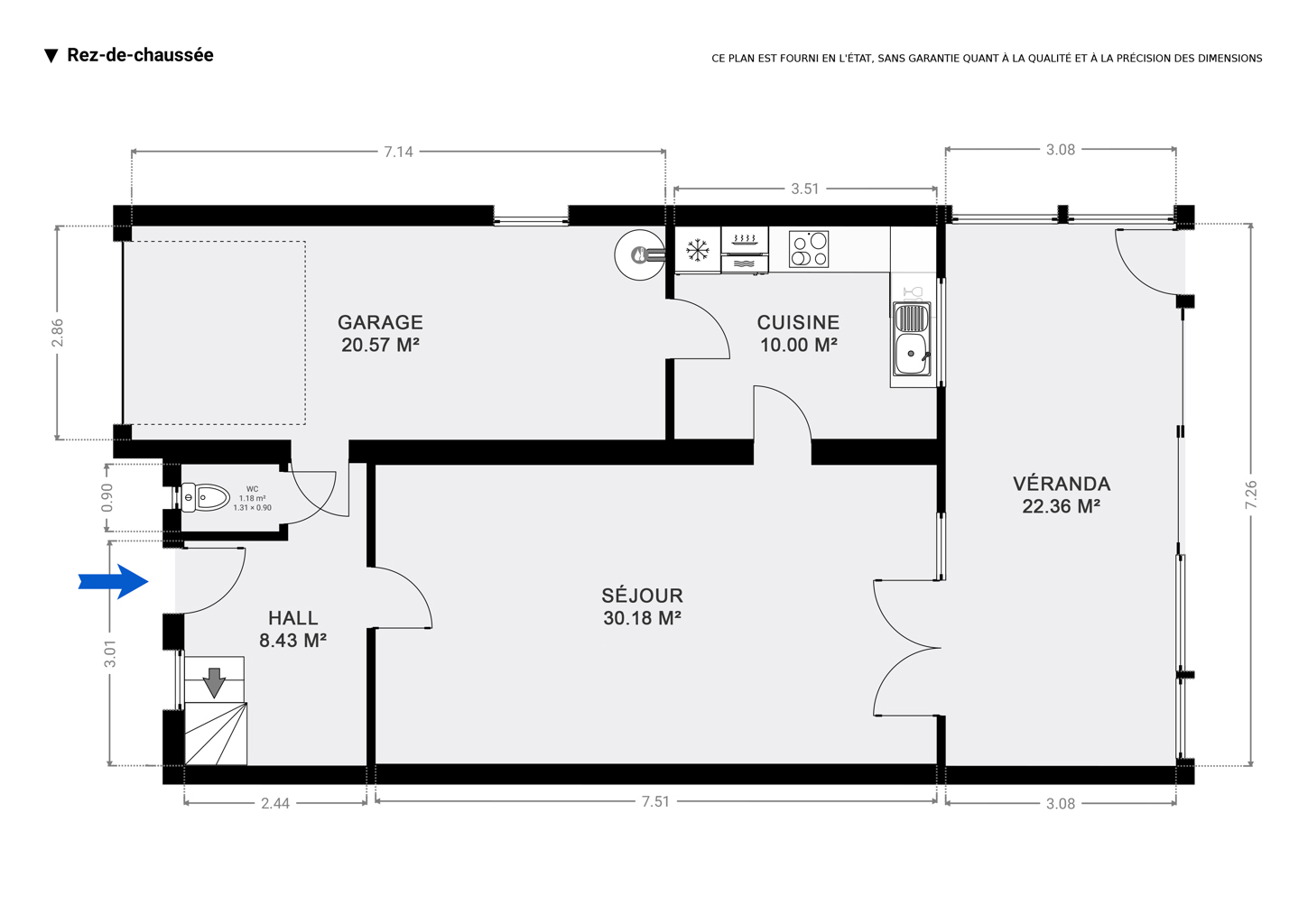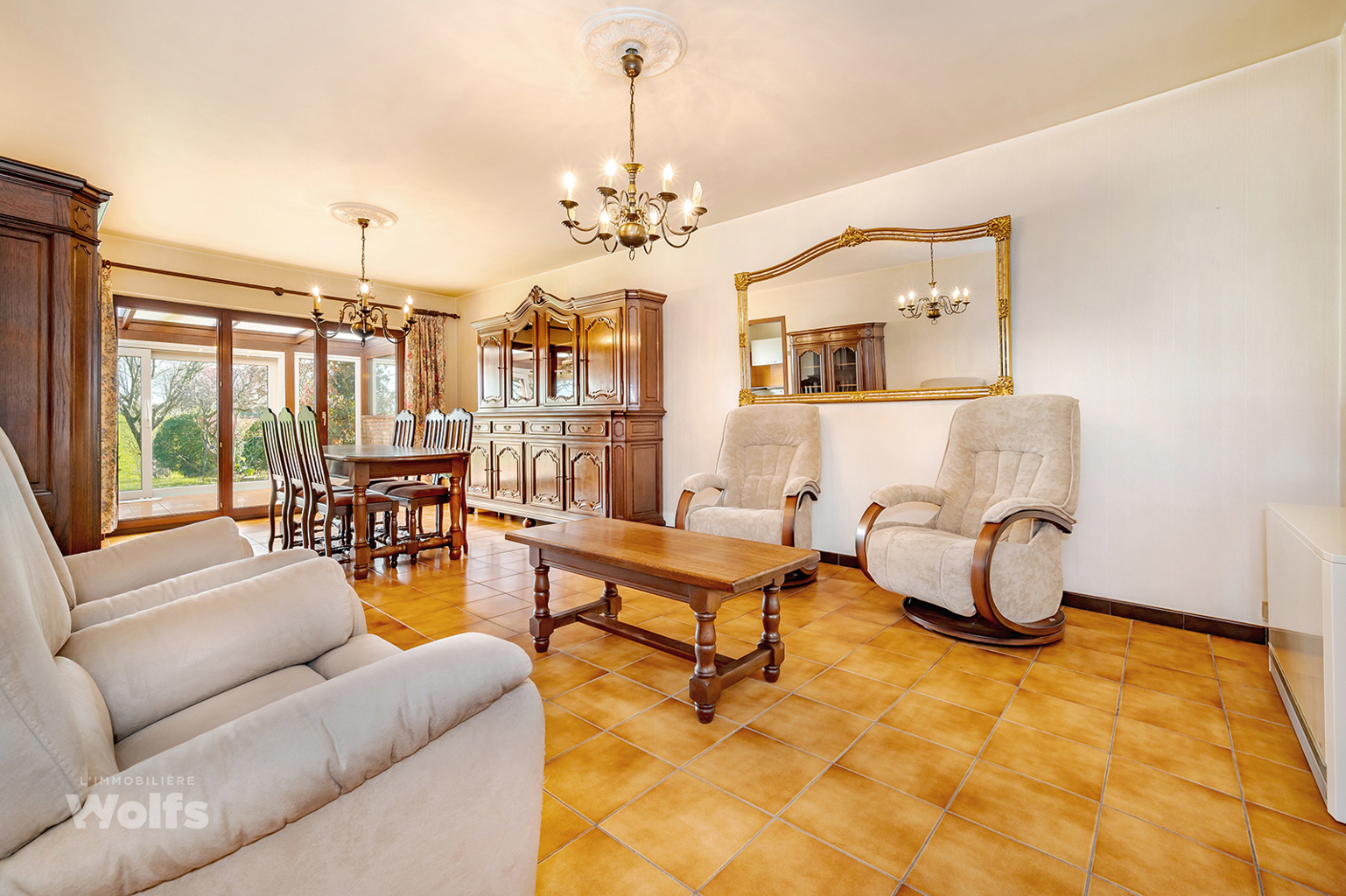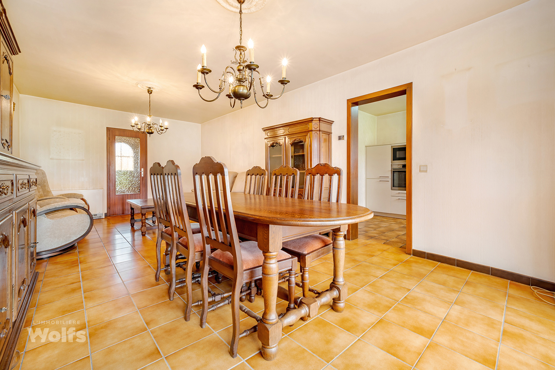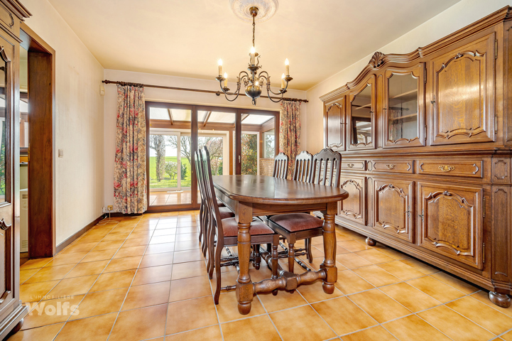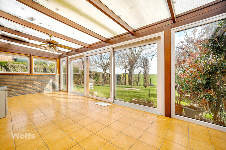 Gelijkvloers : inkomhal, apart toilet, woonkamer van +/- 30 m² (salon, eetkamer), ingerichte keuken van +/- 10 m², veranda van +/- 23 m².