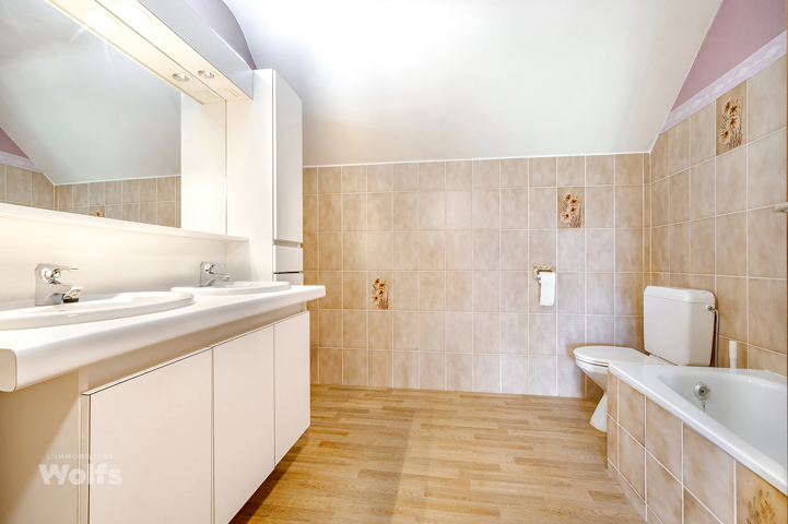 1e verdieping : nachthal, drie slaapkamers van +/- 11, 13 en 15 m², badkamer (bad, wastafel, toilet).