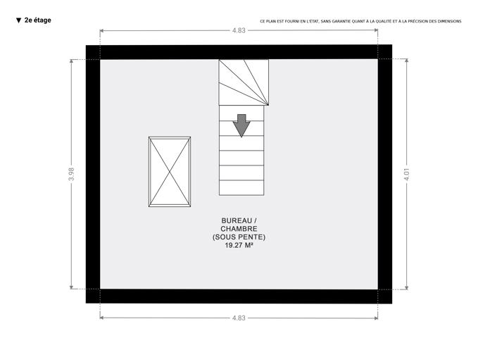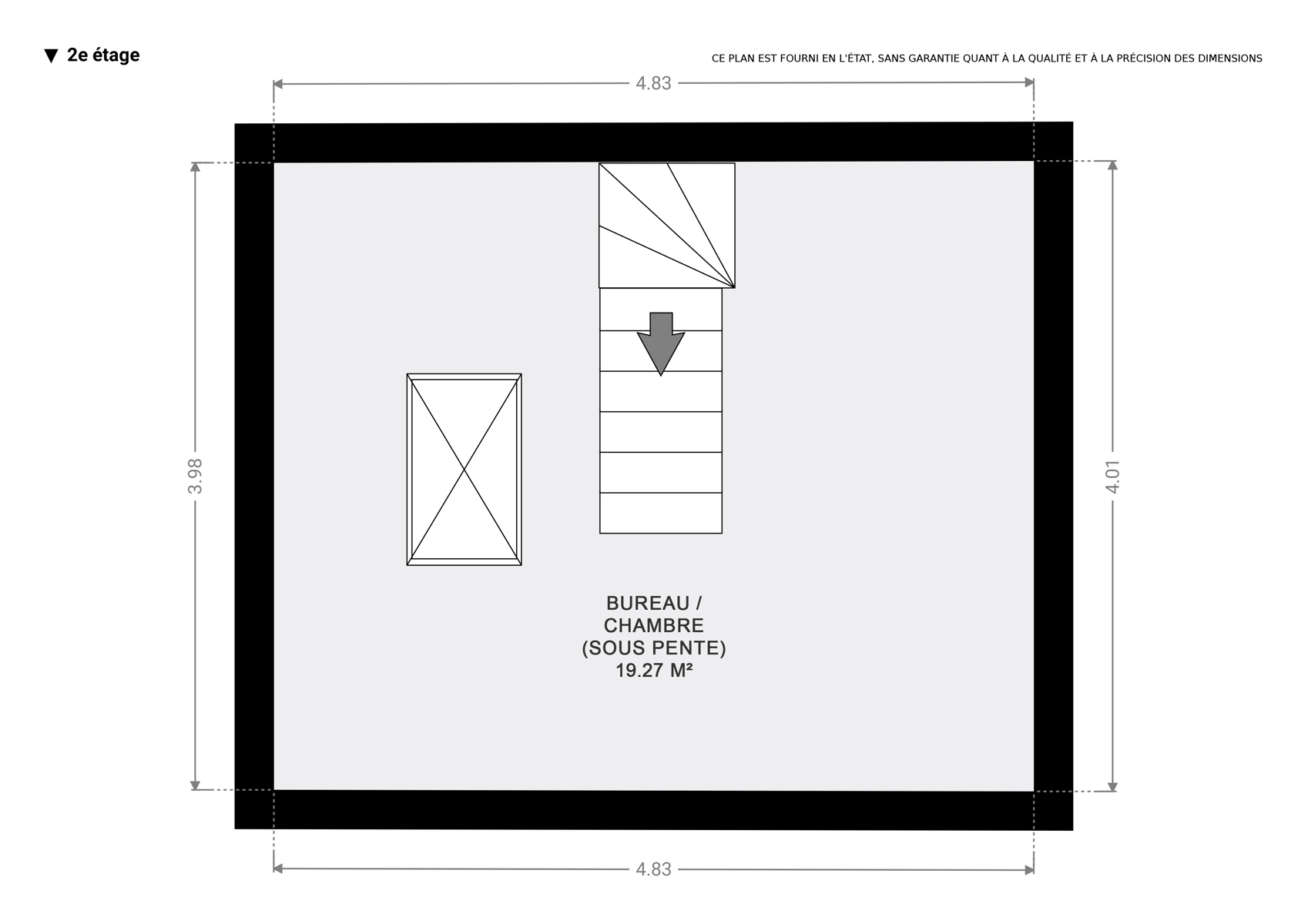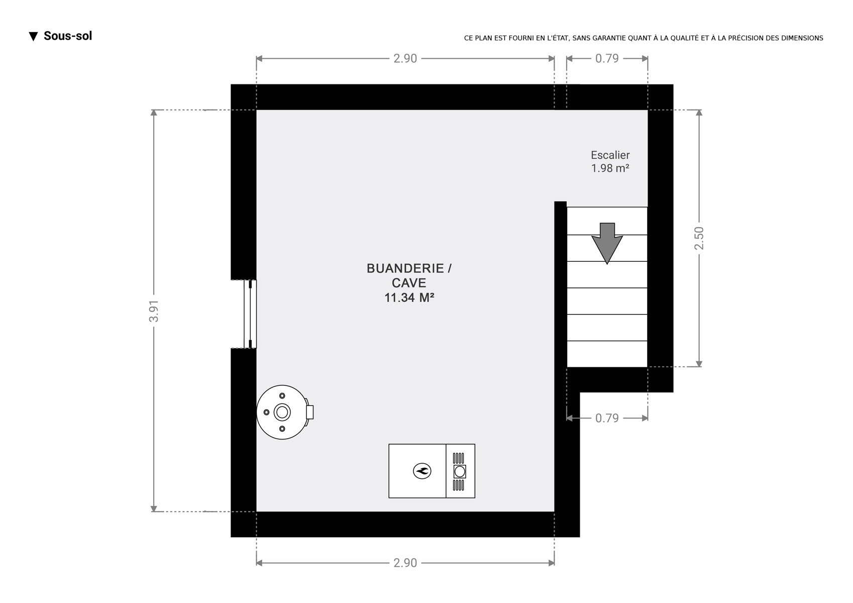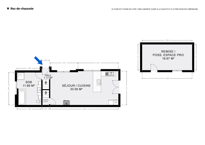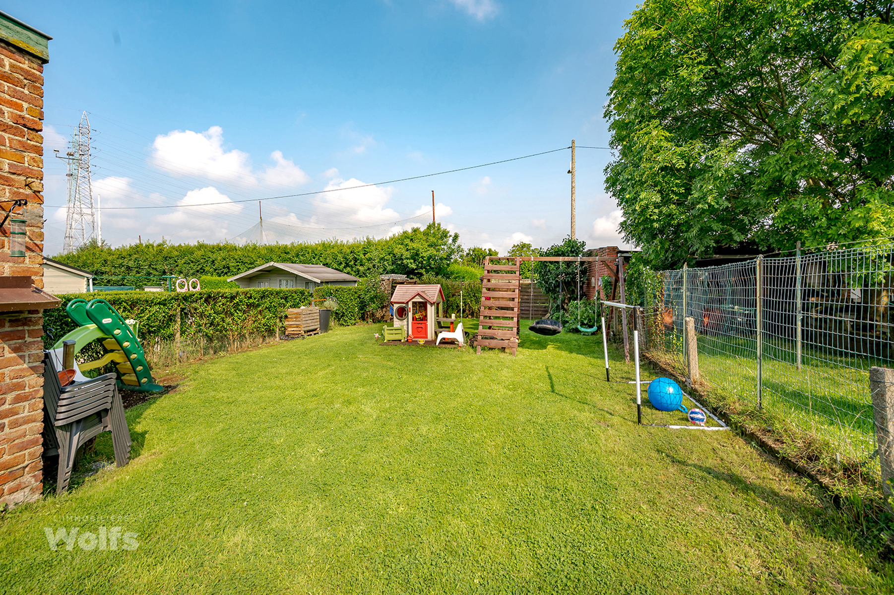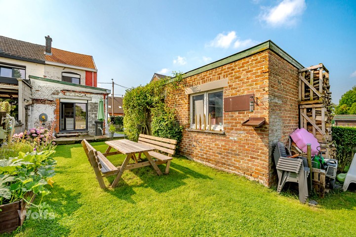 Begane grond : hal, woonkamer van ca. 34 m² met open inbouwkeuken (uitbreiding mogelijk, bouwvergunning verleend), badkamer van ca. 12 m² (ligbad, douche, wastafel, toilet), tuin, bijgebouw van ca. 20 m² (professioneel gebruik mogelijk), parkeerplaats aan de voorzijde.