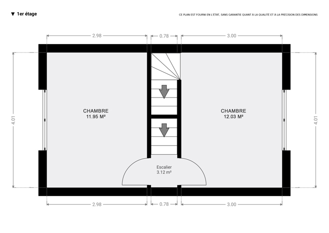 1e verdieping : hal, twee slaapkamers van 2 x ca. 12 m².