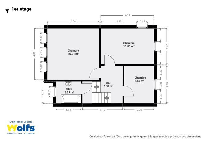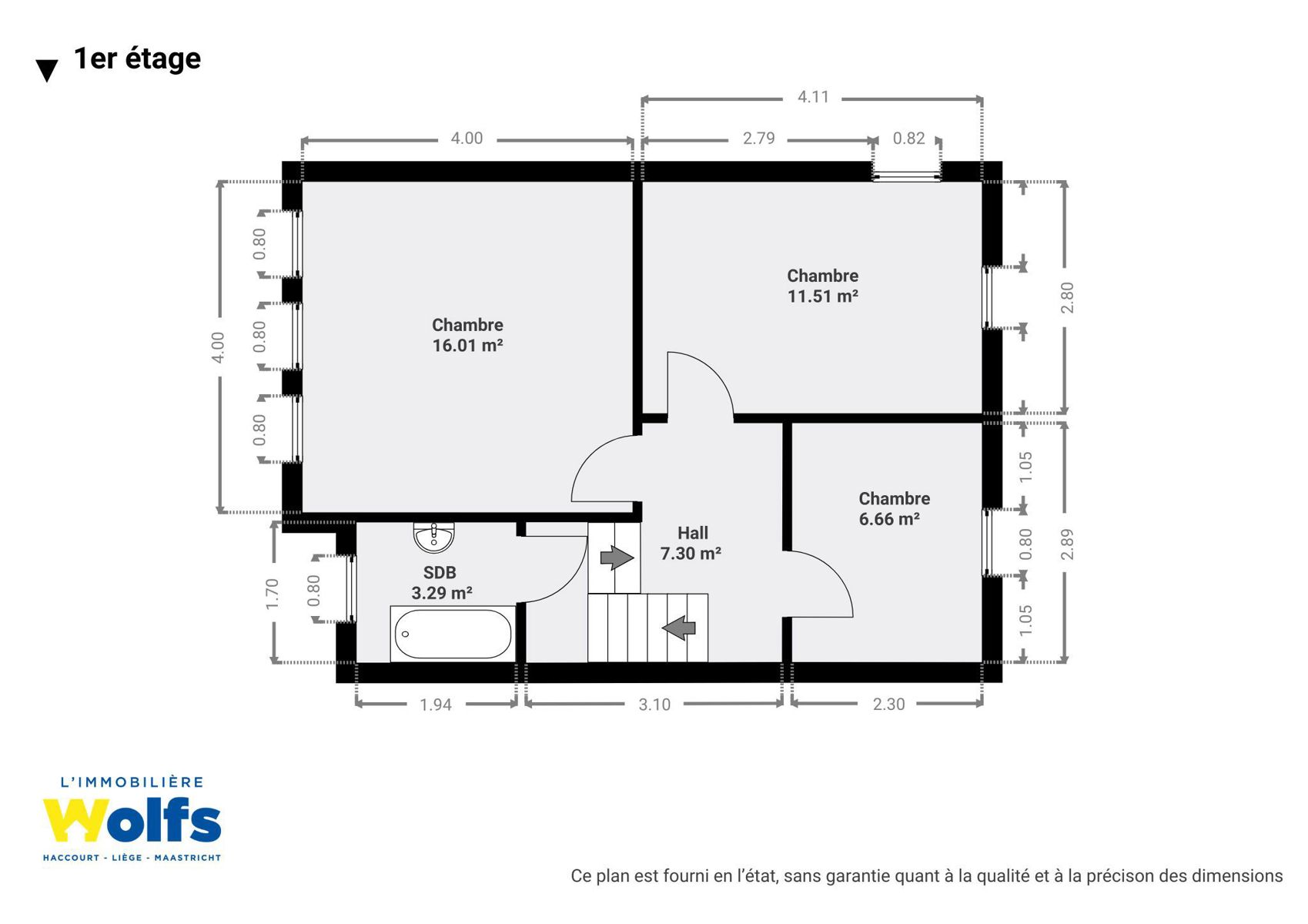 1e verdieping : nachthal, badkamer (wastafel en ligbad), drie slaapkamers van ca. 7, 12 en 16 m² (inclusief een kleine babykamer of studeerkamer).