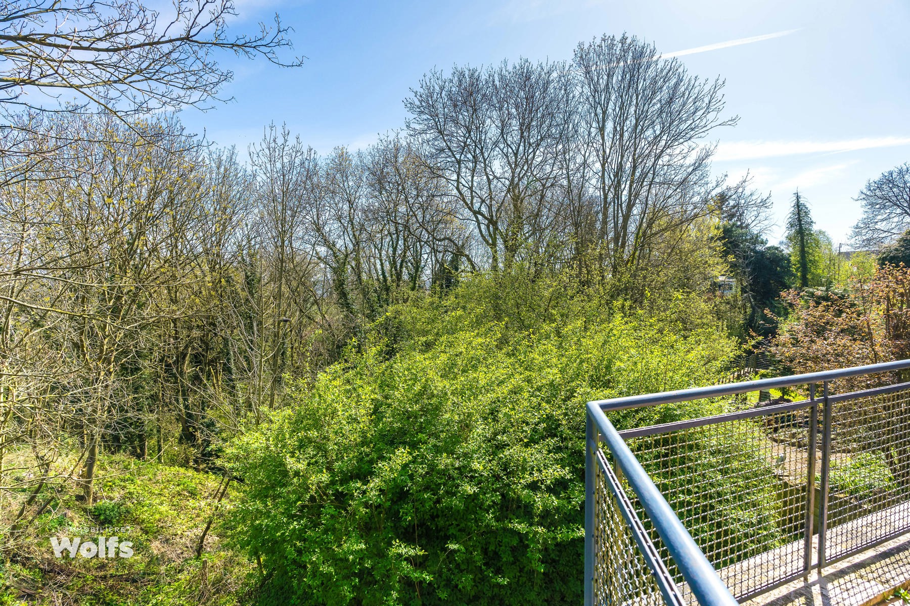 Begane grond : hal, keuken, lichte woonkamer van 32 m² met balkon en prachtig uitzicht over de vallei, zij- en achtertuin, grote bosrijke omgeving aan de achterzijde.