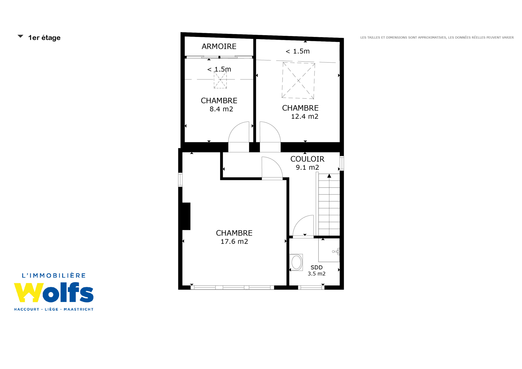 Etage : nachthal, drie slaapkamers van ongeveer 9, 12 en 18 m², doucheruimte (wastafel en douche).