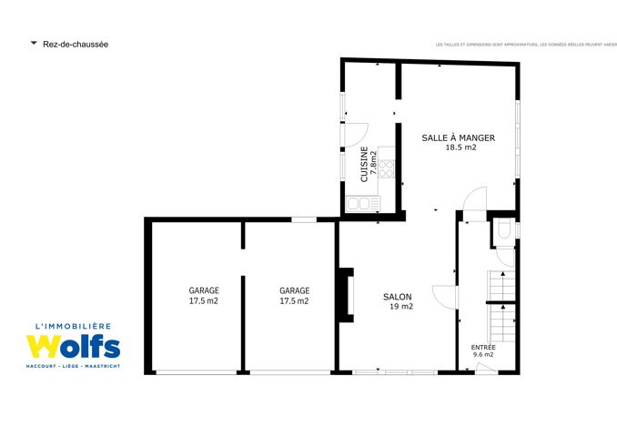 Begane grond : hal, apart toilet, woonkamer van ongeveer 38 m² (salon en eetkamer), ingerichte keuken, twee garages van ongeveer 18 m² elk, terras met tuin.
