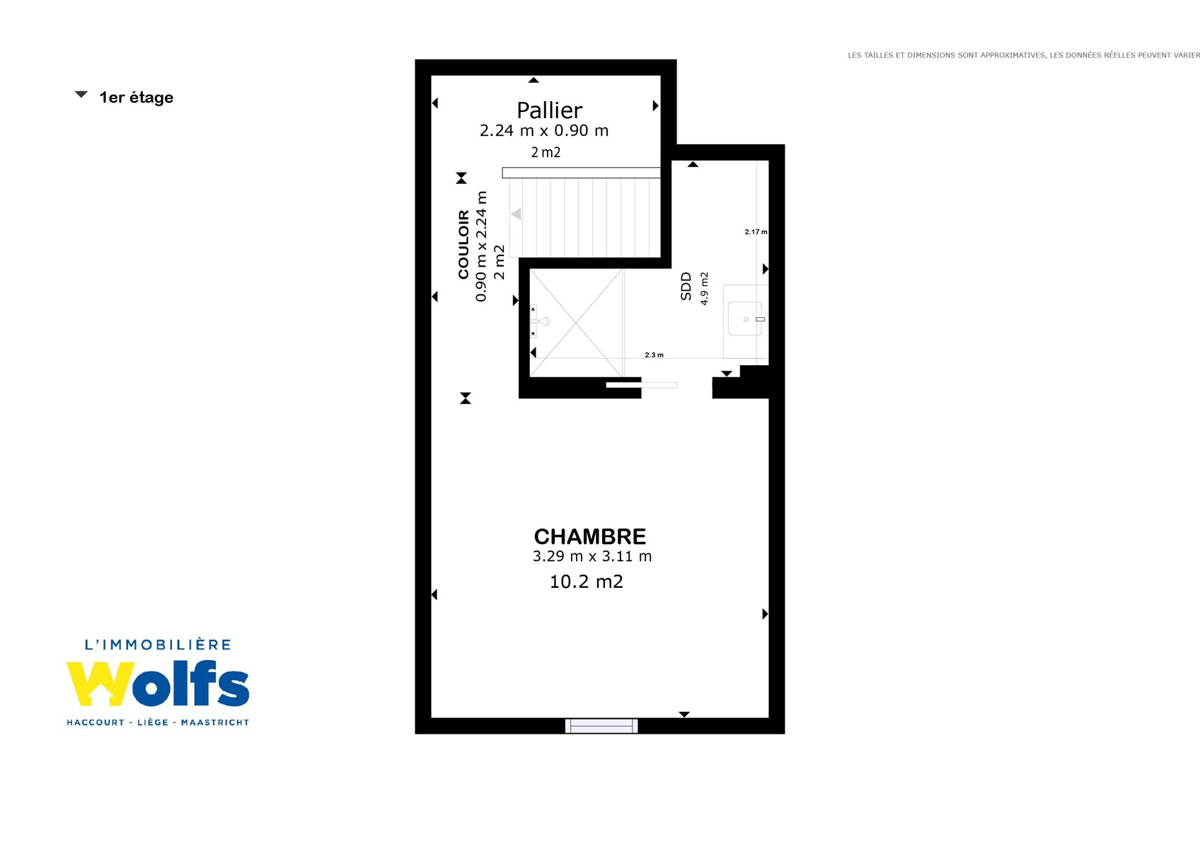 Etage : overloop, doucheruimte, +/- 10 m² slaapkamer.