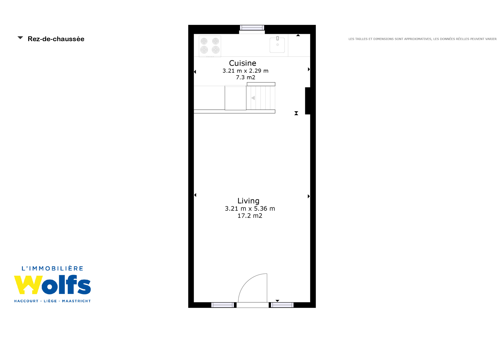 Begane grond : woonkamer van +/- 17 m² met salon en eetkamer, ingerichte keuken van +/- 7 m², terras.