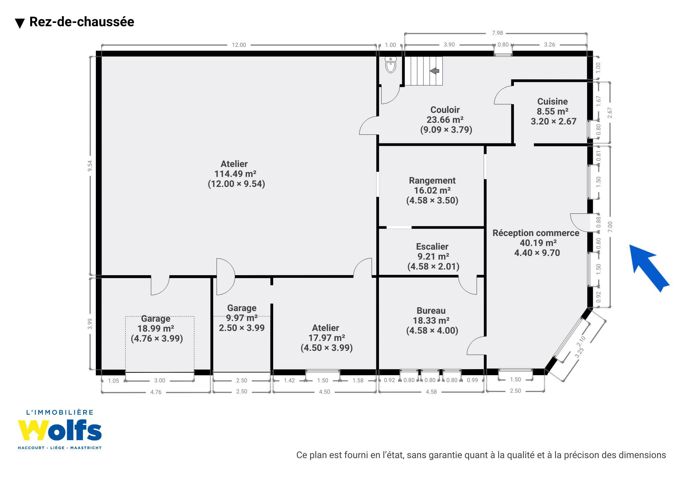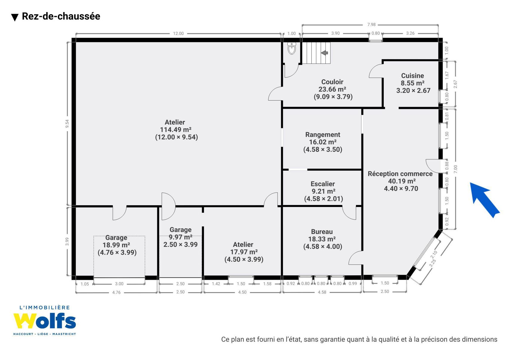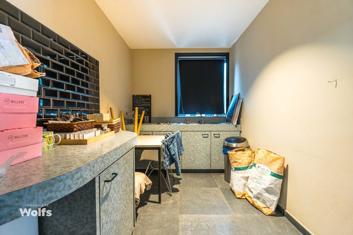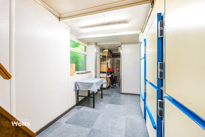 Begane grond : commerciële ruimte van ongeveer 83 m², werkplaats van ongeveer 130 m², twee garages van ongeveer 10 en 19 m², woonkamer, apart toilet.