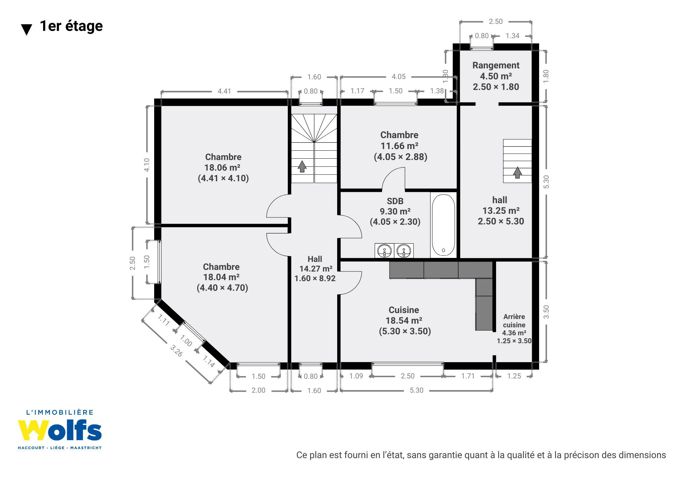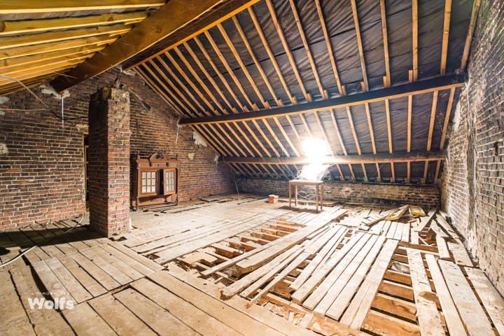 1e verdieping : hal, drie slaapkamers, ingerichte keuken, bijkeuken, badkamer (bad en wastafels), toegang tot zolder.
