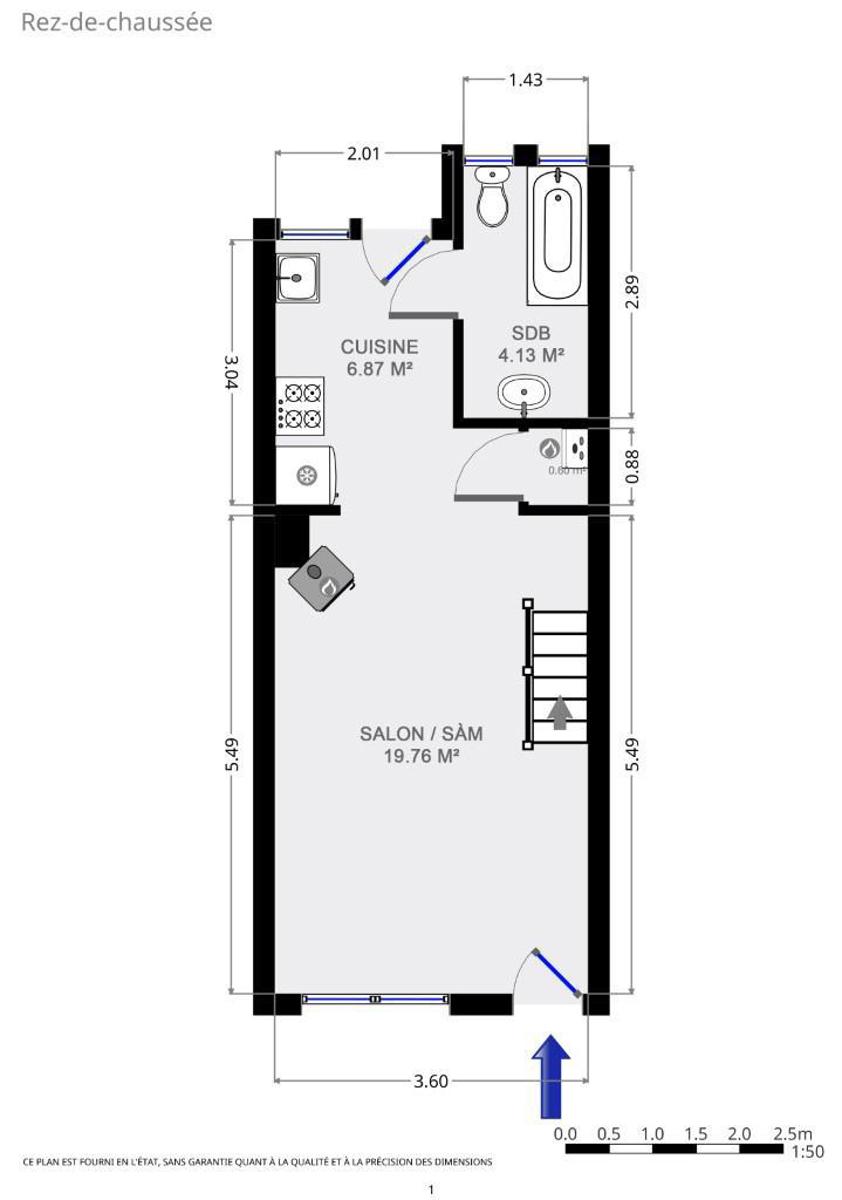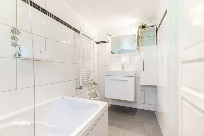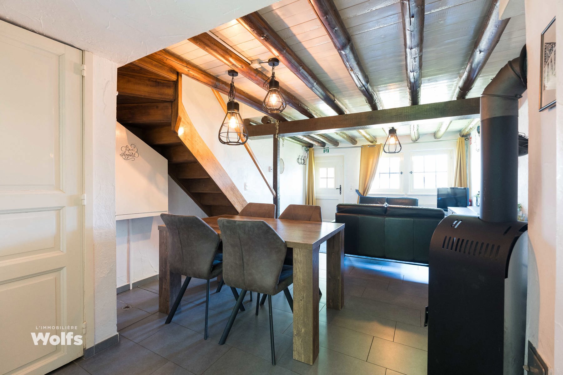 Begane grond : mooie woonkamer, grote ingerichte keuken met eethoek, doucheruimte (wastafel, douche en toilet), privéterras.