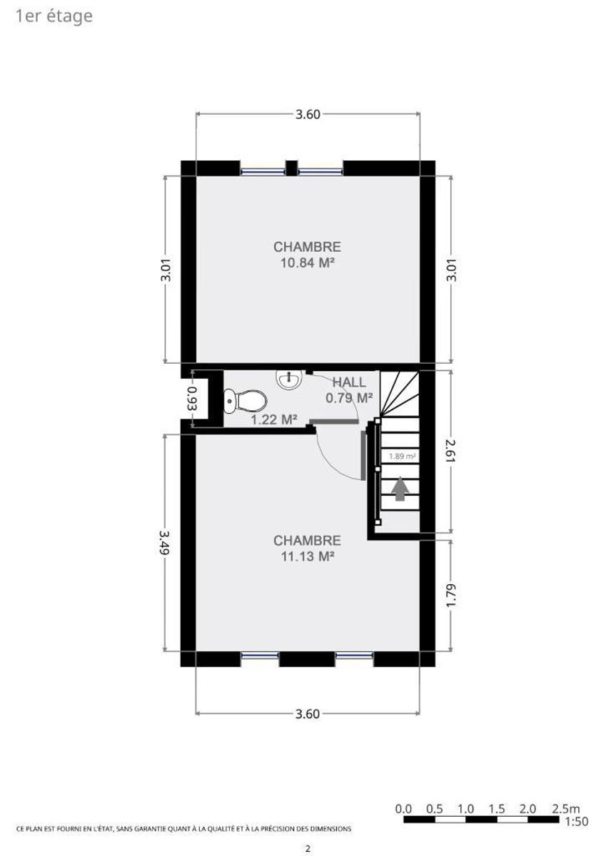 Eerste verdieping : overloop, drie slaapkamers (6, 11 en 16 m²), apart toilet.