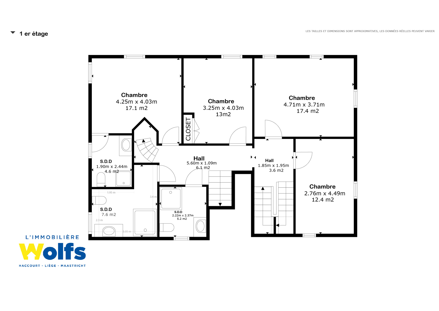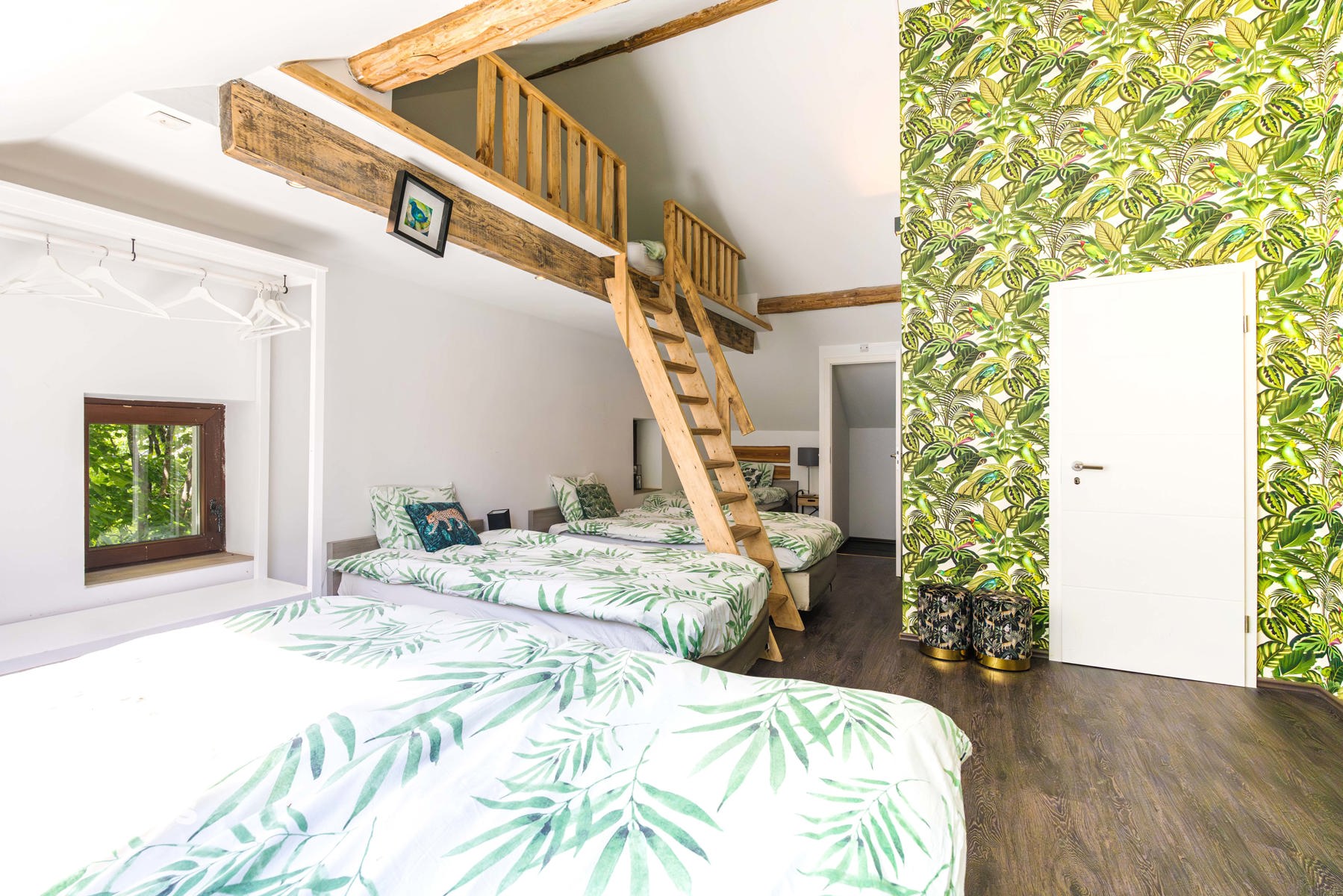 1e verdieping : nachthal, vier tweepersoonsslaapkamers, drie badkamers.