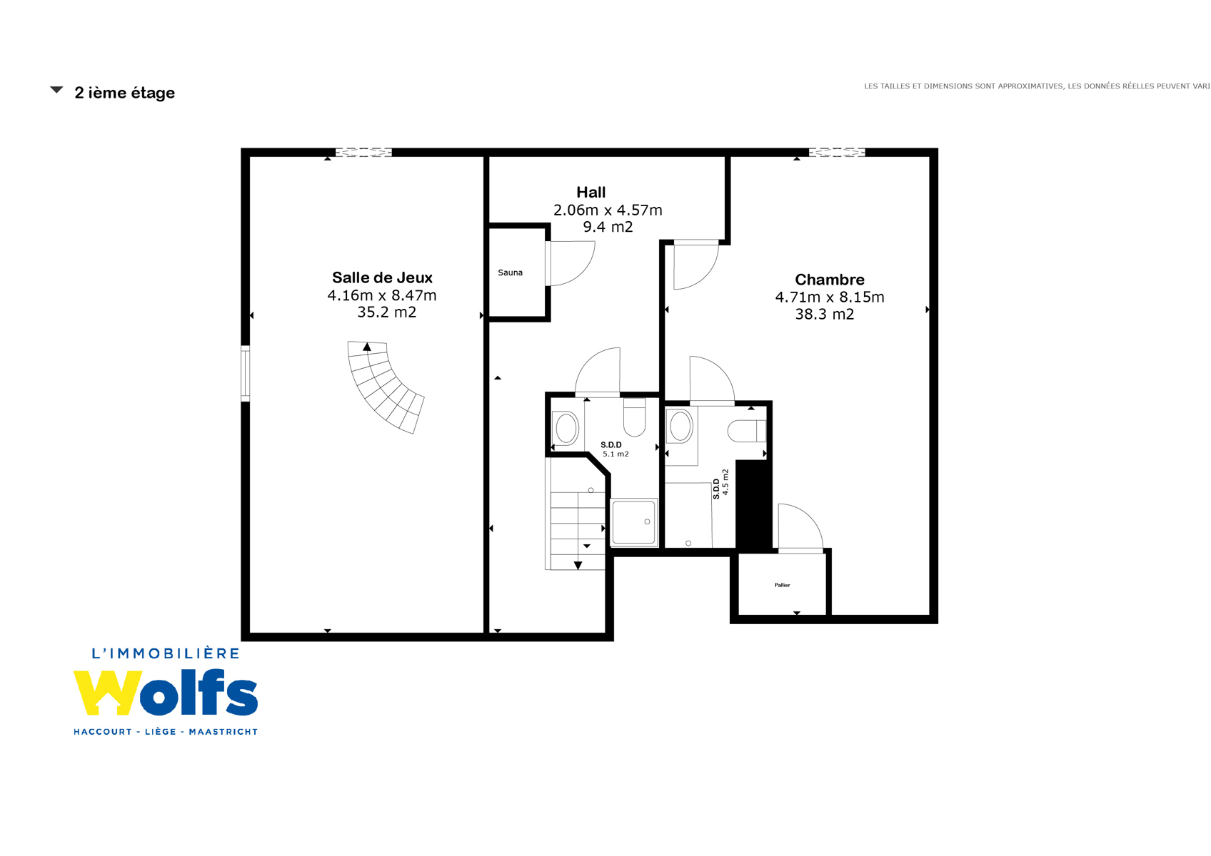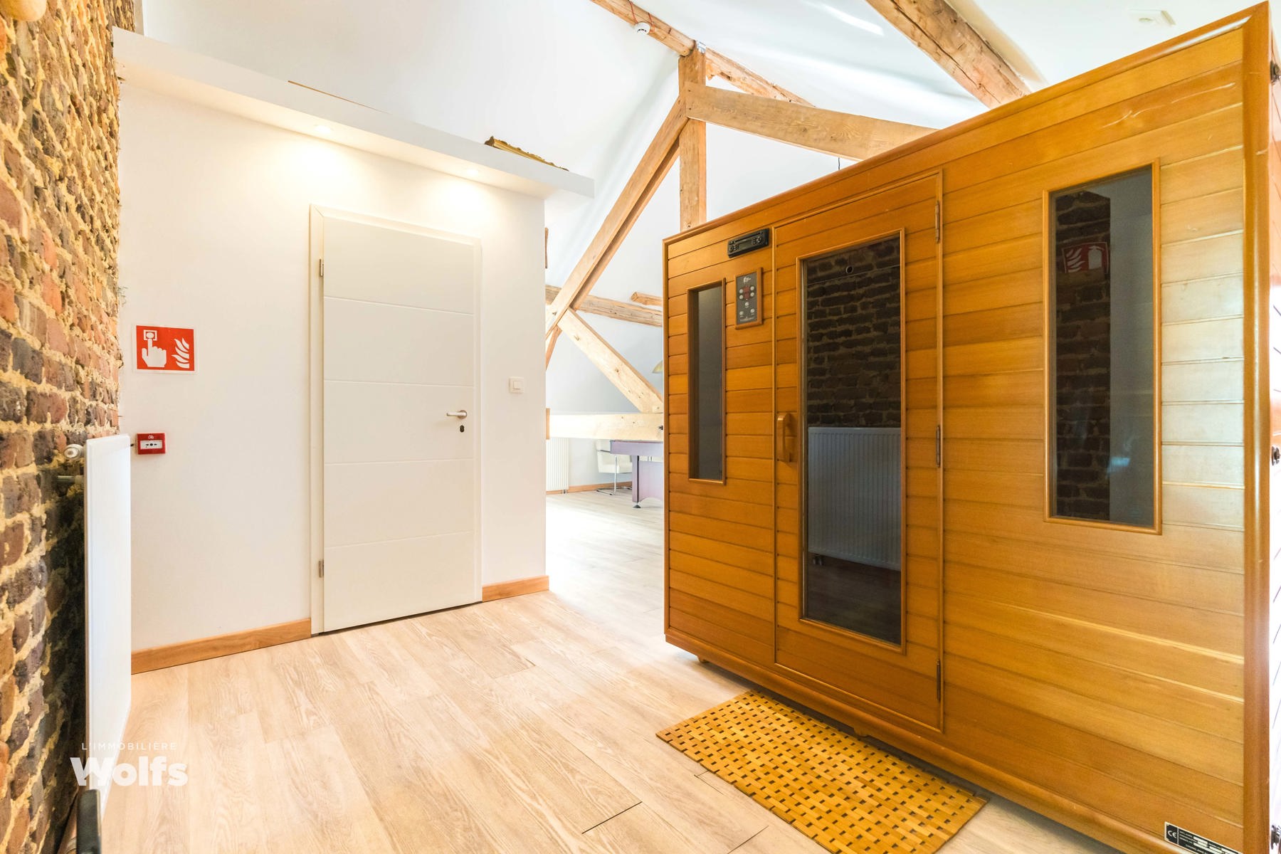 2e verdieping : grote overloop met speelruimte en sauna, badkamer, grote zespersoonsslaapkamer met aangrenzende badkamer.