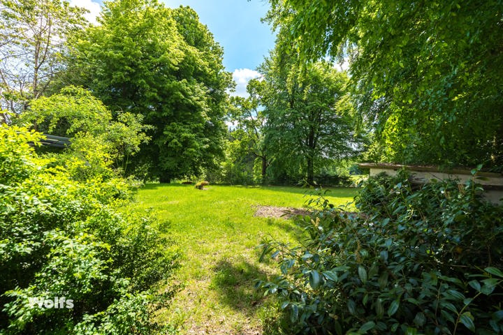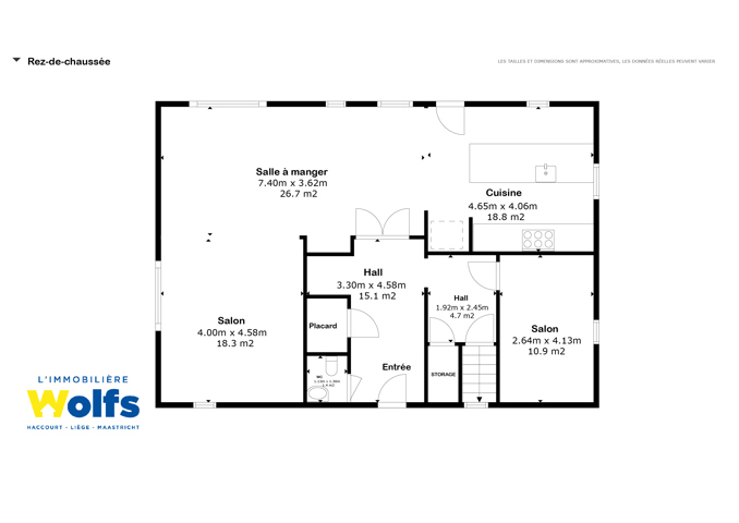 Begane grond : inkomhal, apart toilet, ruime +/- 64 m² woonkamer (salon, eetkamer) met open volledig ingerichte keuken, TV salon, tuin met bomen, verschillende terrassen, parking vooraan.
