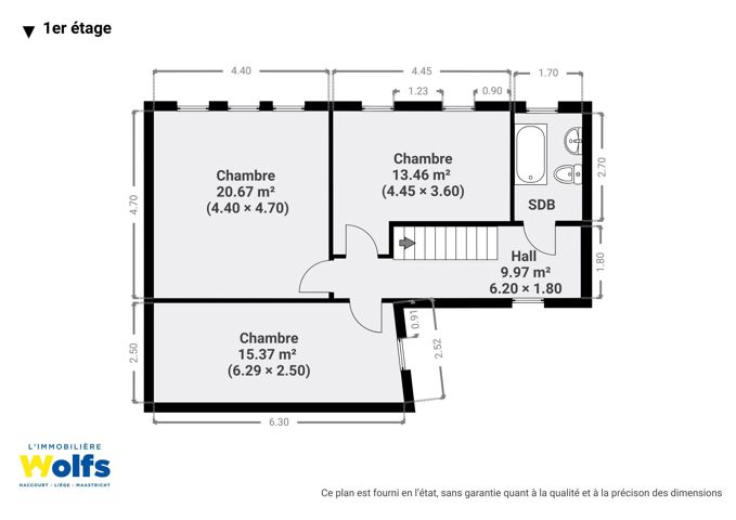1e verdieping : nachthal, drie slaapkamers van ongeveer 13, 15 en 20 m², badkamer (bad, wastafel, toilet).