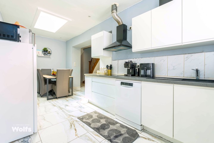 Begane grond : hal, 32 m² woonkamer (salon, eetkamer), grote ingerichte keuken van 25 m², bijkeuken, apart toilet, binnenplaats met grote opslagruimte.
