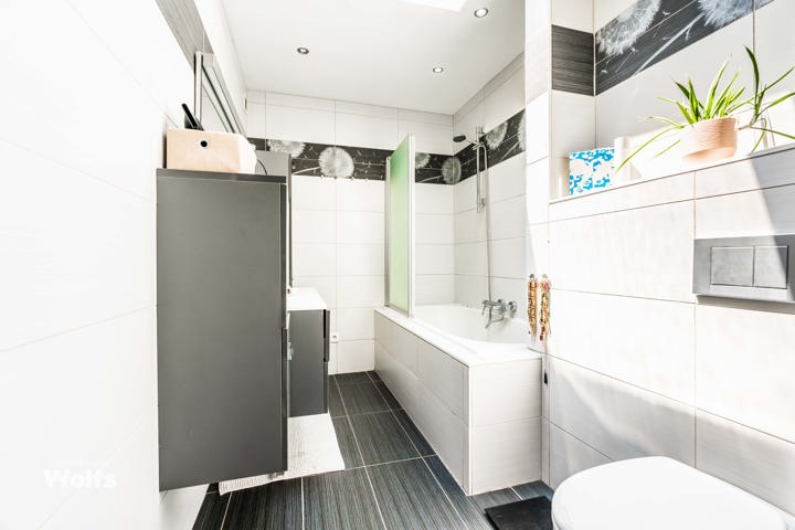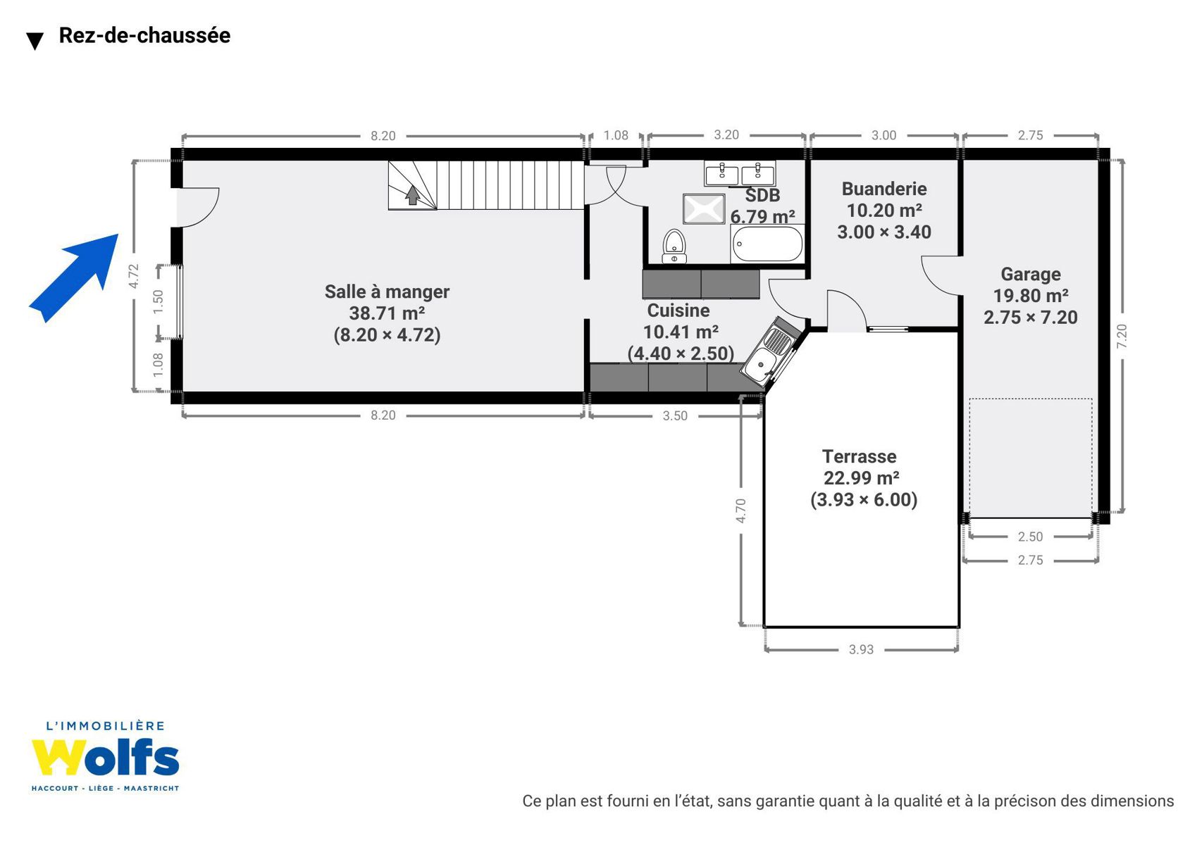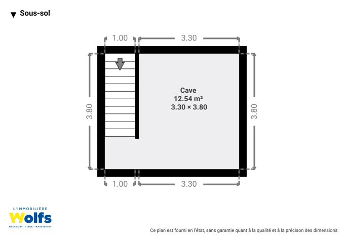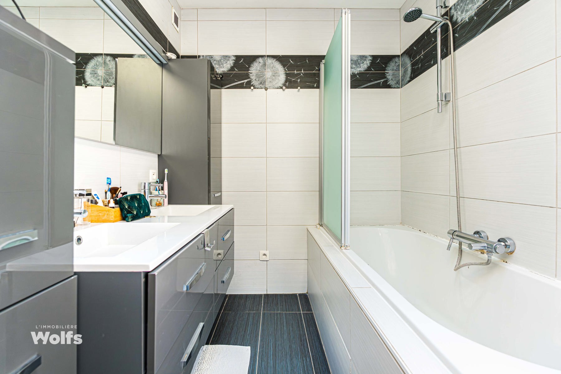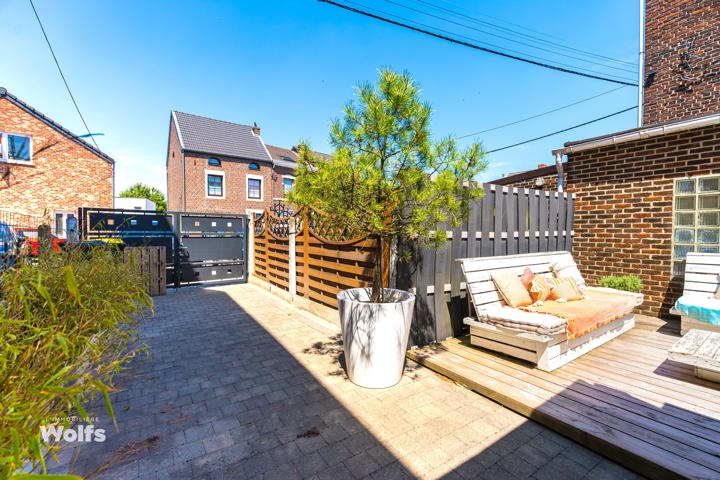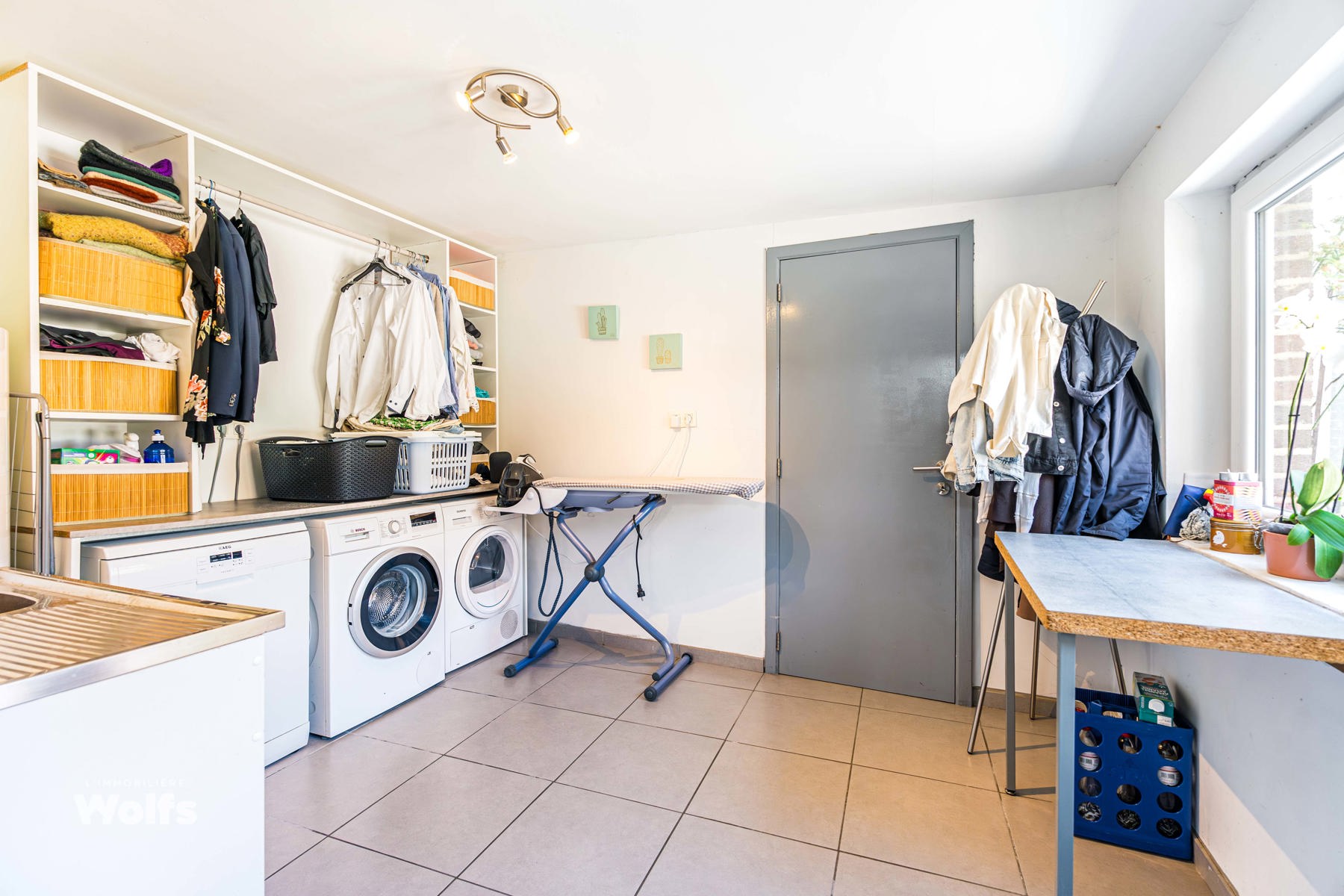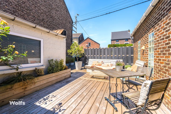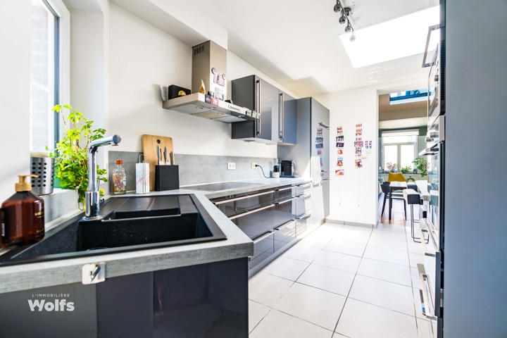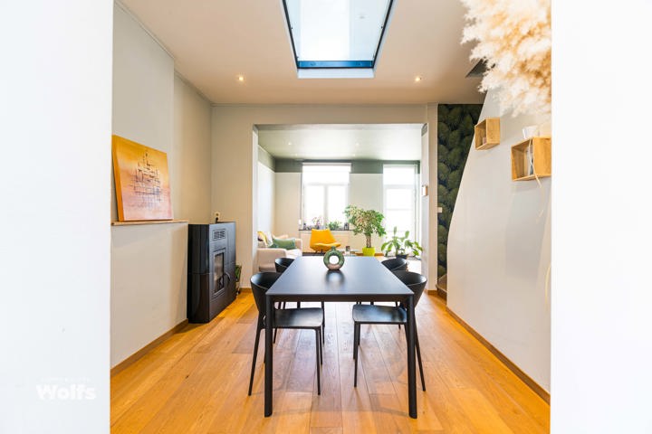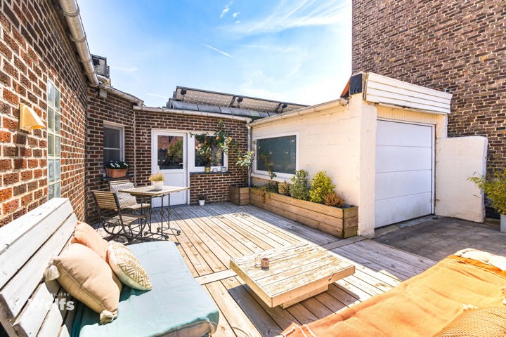 Begane grond : leefruimte van +/- 39 m² met woonkamer en eetkamer, ingerichte keuken, badkamer (wastafels, toilet en bad), wasruimte, garage van +/- 20 m², mooi terras van +/- 23 m² met uitzicht op een binnenplaats, en een eigen parkeerplaats.
