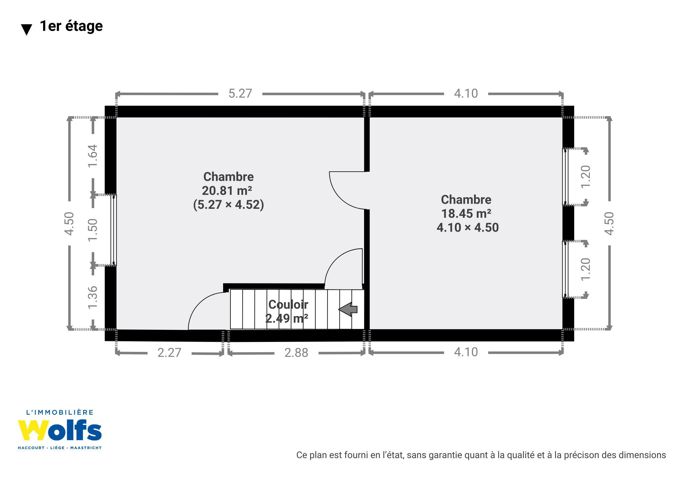 1e verdieping : twee ruime slaapkamers van +/- 19 en 20 m², waarvan één in het verlengde van de andere.