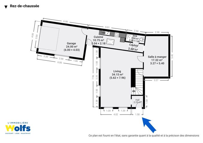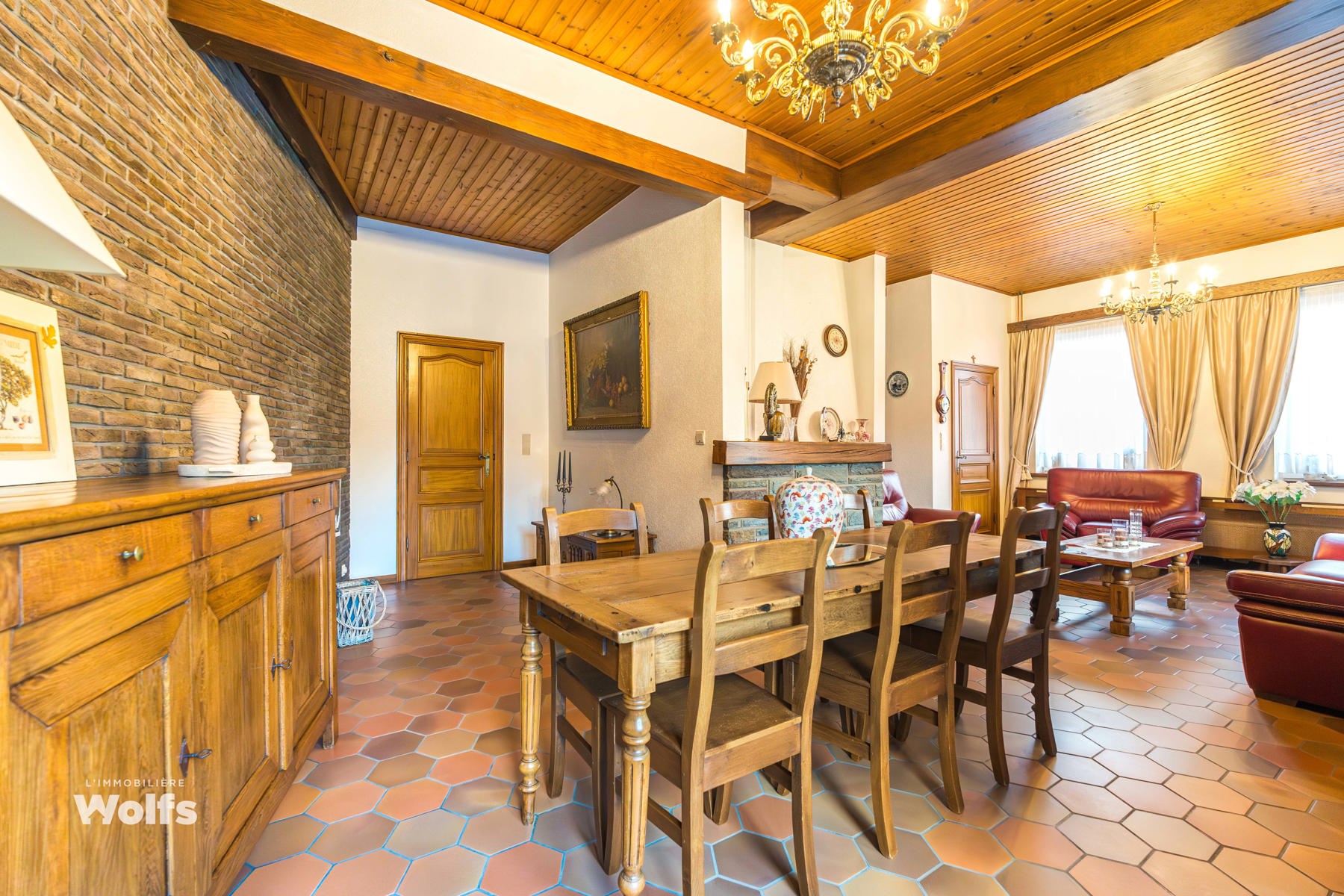 Begane grond : hal met garderobe, ingerichte keuken, woonkamer van ca. 34 m² (salon, eetkamer) met open haard en grote ramen met uitzicht op de tuin, kamer van ca. 17 m² met tal van gebruiksmogelijkheden en mogelijkheid van onafhankelijke toegang via de kleine binnenplaats en poort aan de voorzijde.
