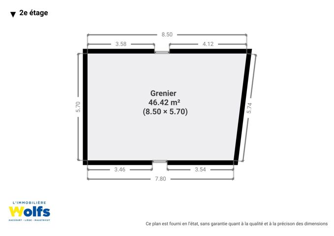 Zolder : 46 m² zolder die verbouwd zou kunnen worden tot een vierde slaapkamer, momenteel bereikbaar via een uitschuifbare trap, maar mogelijkheid om een normale trap te installeren door de slaapkamer van 17 m² iets te verkleinen.