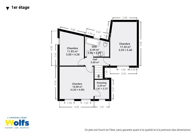 Etage : overloop, nachthal, drie slaapkamers van ca. 12, 17 en 18 m², waarvan één met een kleine kleedkamer, badkamer (wastafel, ligbad en toilet).