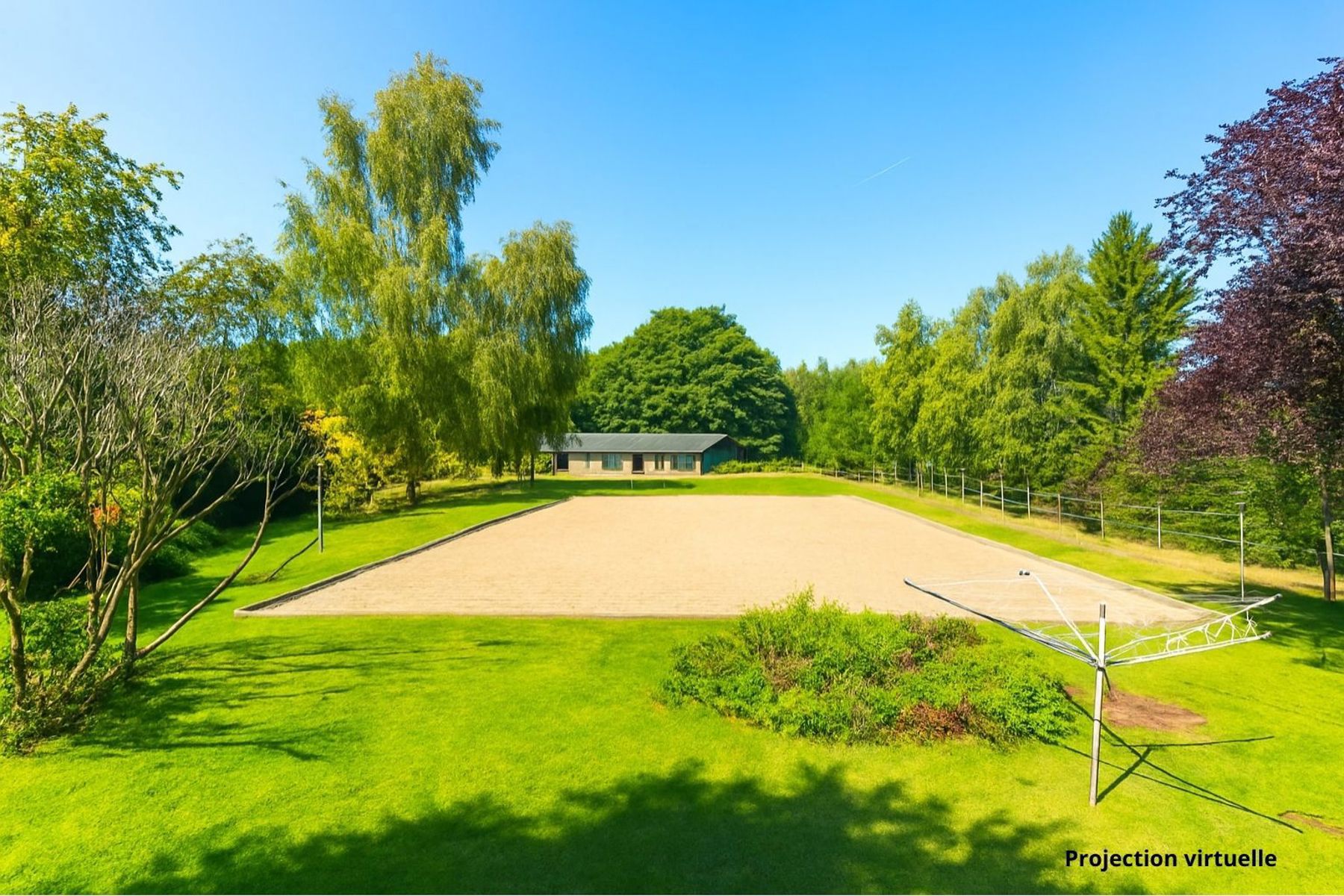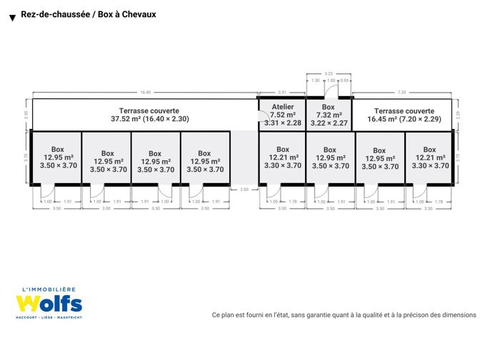 Begane grond : inkomhal, apart toilet, woonkamer (salon, eetkamer) met houtkachel, ingerichte keuken, garage, terras, aangename tuin, manege, acht paardenboxen met aparte toegang, weiden.