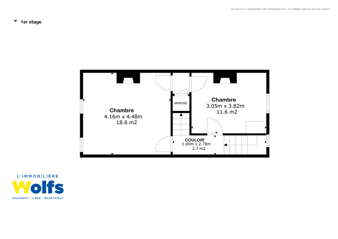 1e verdieping : nachthal, twee slaapkamers van +/- 12 en 19 m².