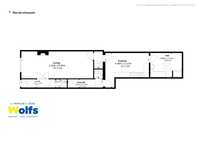 Gelijkvloers : inkomhal, ruime woonkamer van +/- 27 m², grote ingerichte keuken van +/- 22 m², badkamer van +/- 10 m² (wastafel, bad en douche), apart toilet.