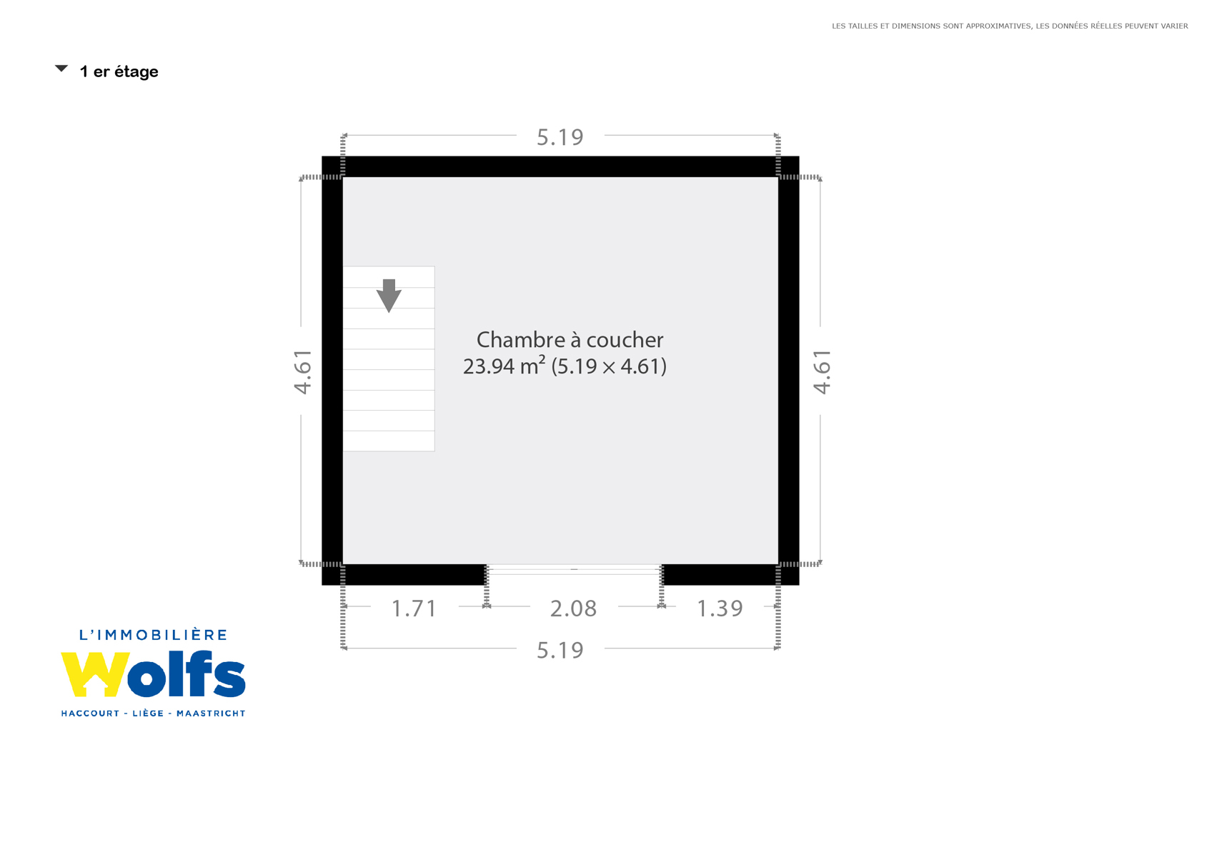 1e verdieping : slaapkamer van +/- 24 m² (mogelijkheid om er een kantoor of kleedkamer in te richten, afhankelijk van de behoeften).