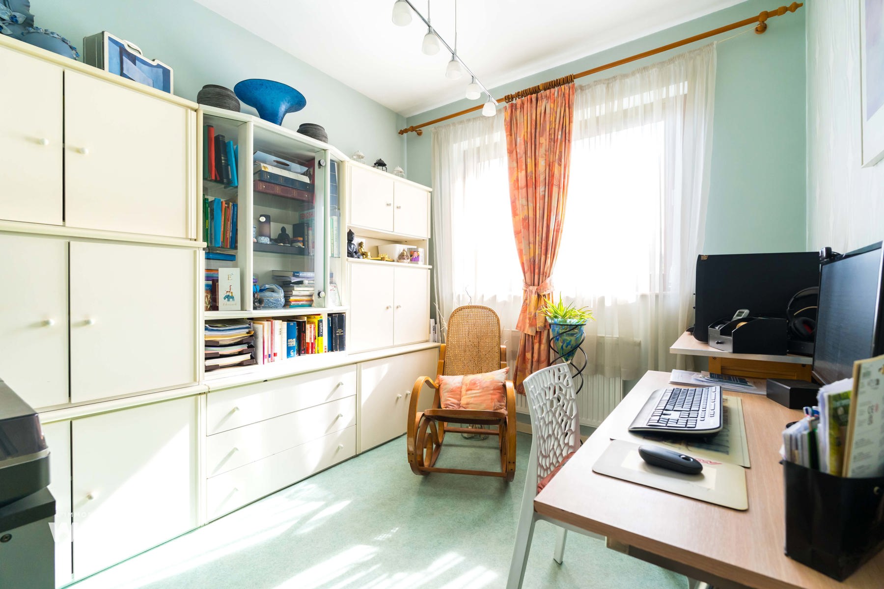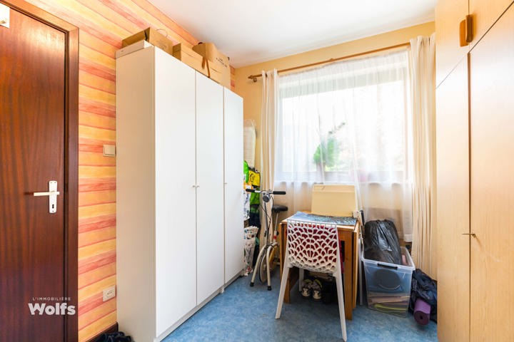 Begane grond : inkomhal, lichte woonkamer van +/- 34 m², keuken van +/- 11 m², badkamer (bad en wastafel), apart toilet, twee slaapkamers van +/- 9 en 12 m², bureau van +/- 8 m², prachtige tuin