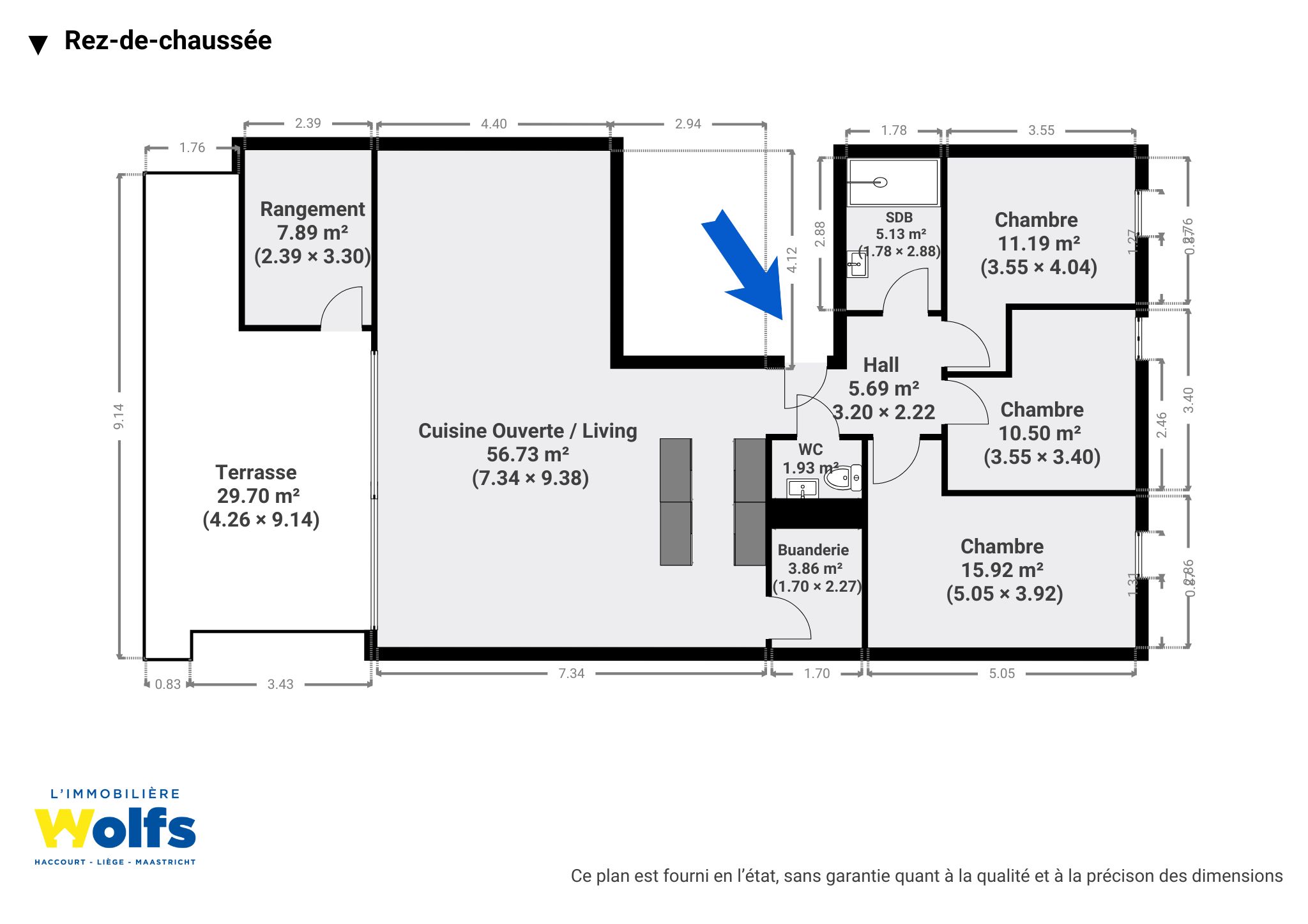 Begane grond : gemeenschappelijke inkomhal, inkomhal, woonkamer van +/- 57 m² met ingerichte keuken, drie slaapkamers van +/- 10, 11 en 16 m², apart toilet, doucheruimte (wastafel, douche), wasruimte, aangename buitenruimte van +/- 62 m² met gedeeltelijk overdekt terras van +/- 29 m² en privétuin van +/- 33 m² met uitzicht op de Maas, afgesloten berging.